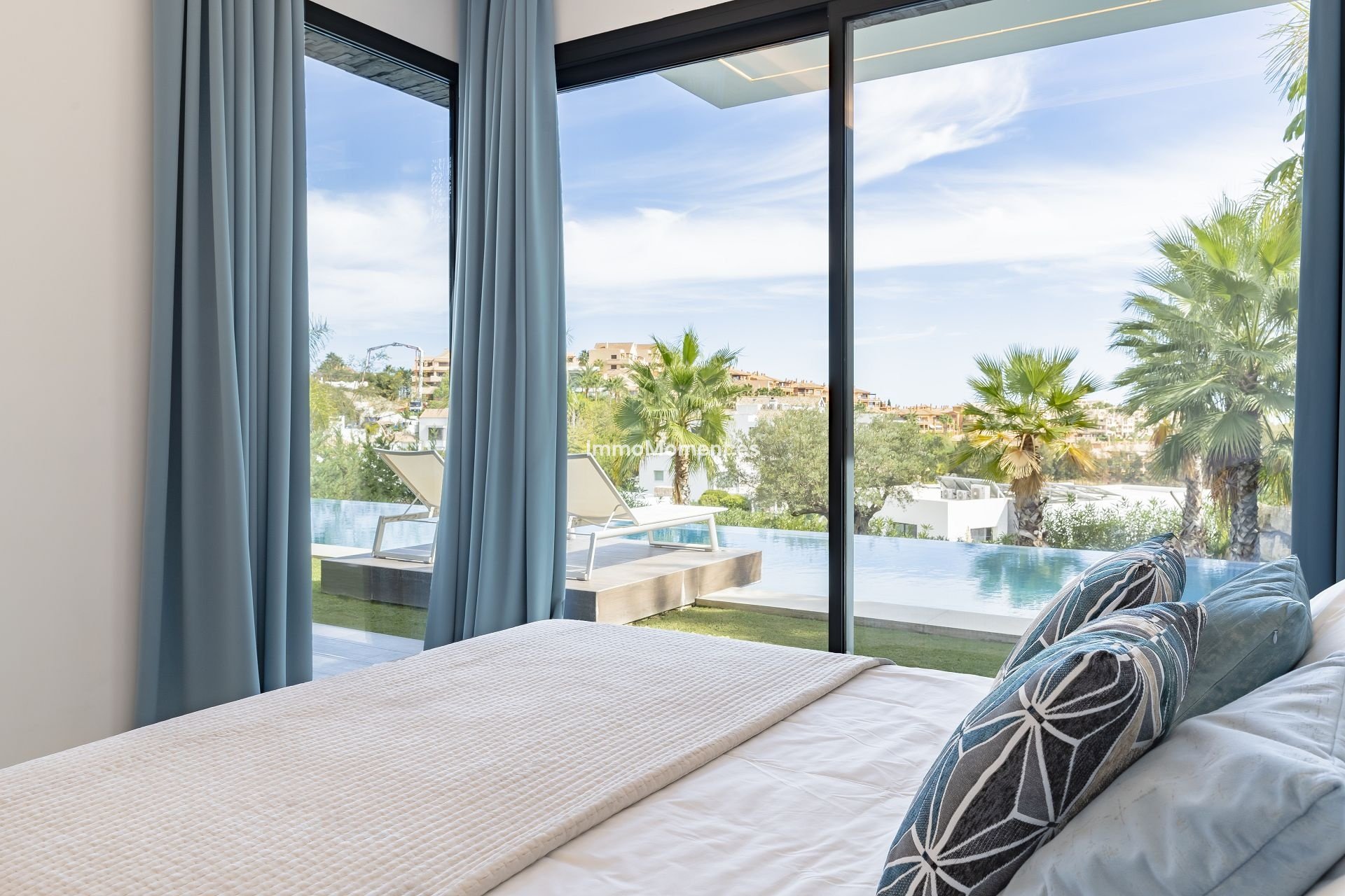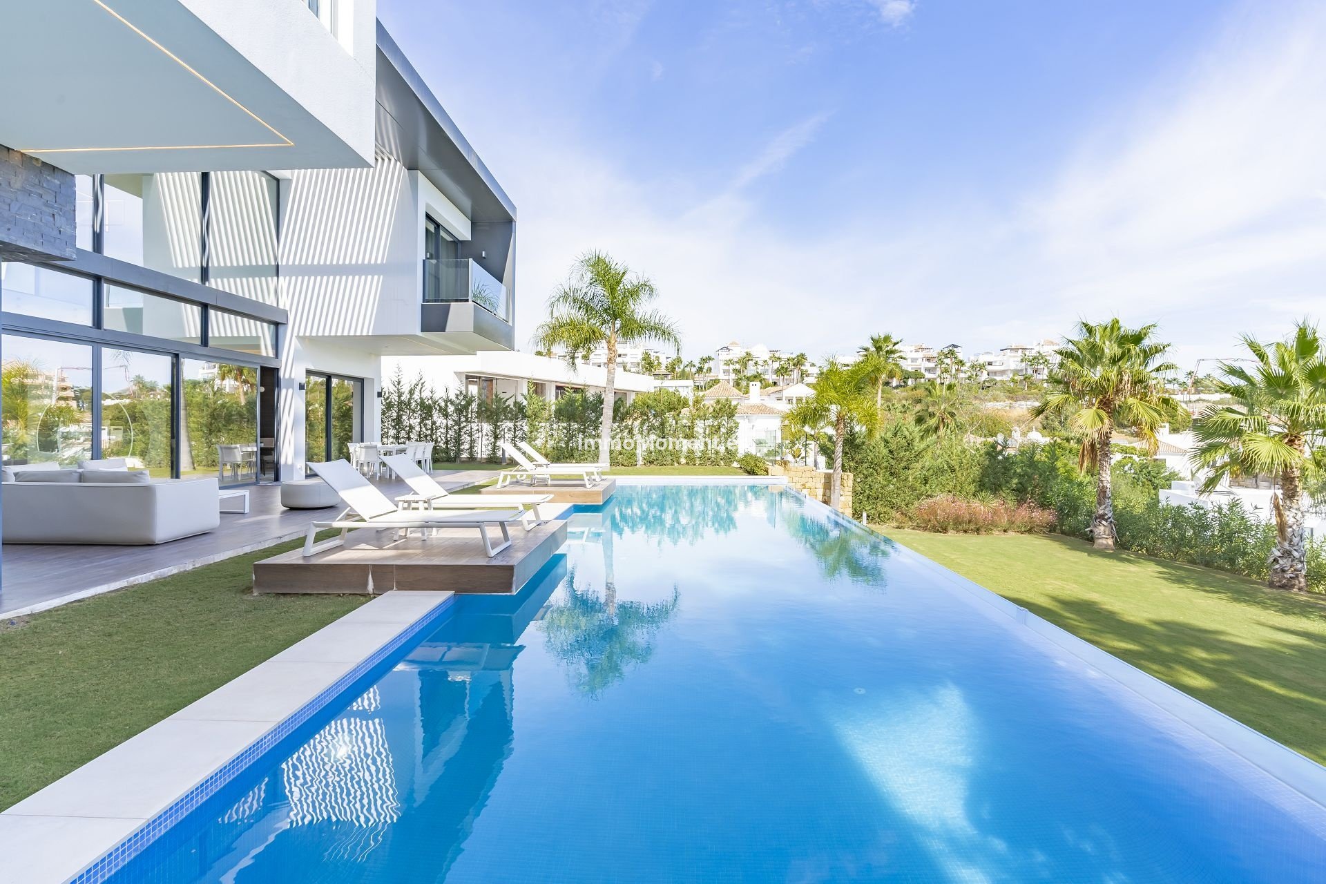 - Infinity-Pool im Freien mit Glaswand - Südlage mit Blick auf den Golfplatz und teilweise auf das Meer - Terrasse mit Sonnenliegen, Essbereich und Sofas im Freien - Kinoraum mit Projektor und Apple TV - Spielebereich (Billard) - Designermöbel - Gasgrill im Freien - voll ausgestattete Küche mit Gaggenau-Geräten - Waschküche - Alarmanlage - High-Speed-Internet mit WiFi - Klimaanlage und Fußbodenheizung - Gemeinschaft mit 24-Stunden-Sicherheit - Nähe zum Golf - Privatparkplatz für 3 Autos