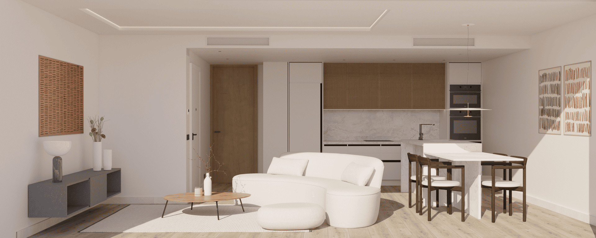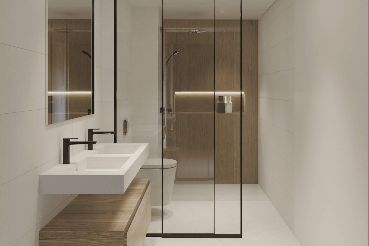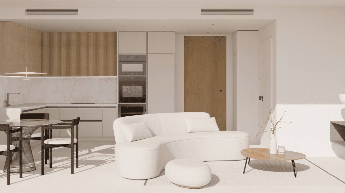 Das Innere der Bungalows ist sorgfältig gestaltet, um Komfort und Stil zu bieten. Mit Feinsteinzeugböden verfügen die Wohnungen über zwei Schlafzimmer und zwei Badezimmer, die ausreichend Platz für Familien oder Paare bieten. Einbauschränke optimieren den Stauraum, während moderne Geräte sicherstellen, dass jedes Zuhause vom ersten Tag an bezugsfertig ist. Die intelligente Raumaufteilung garantiert Funktionalität und Komfort in jedem Winkel.