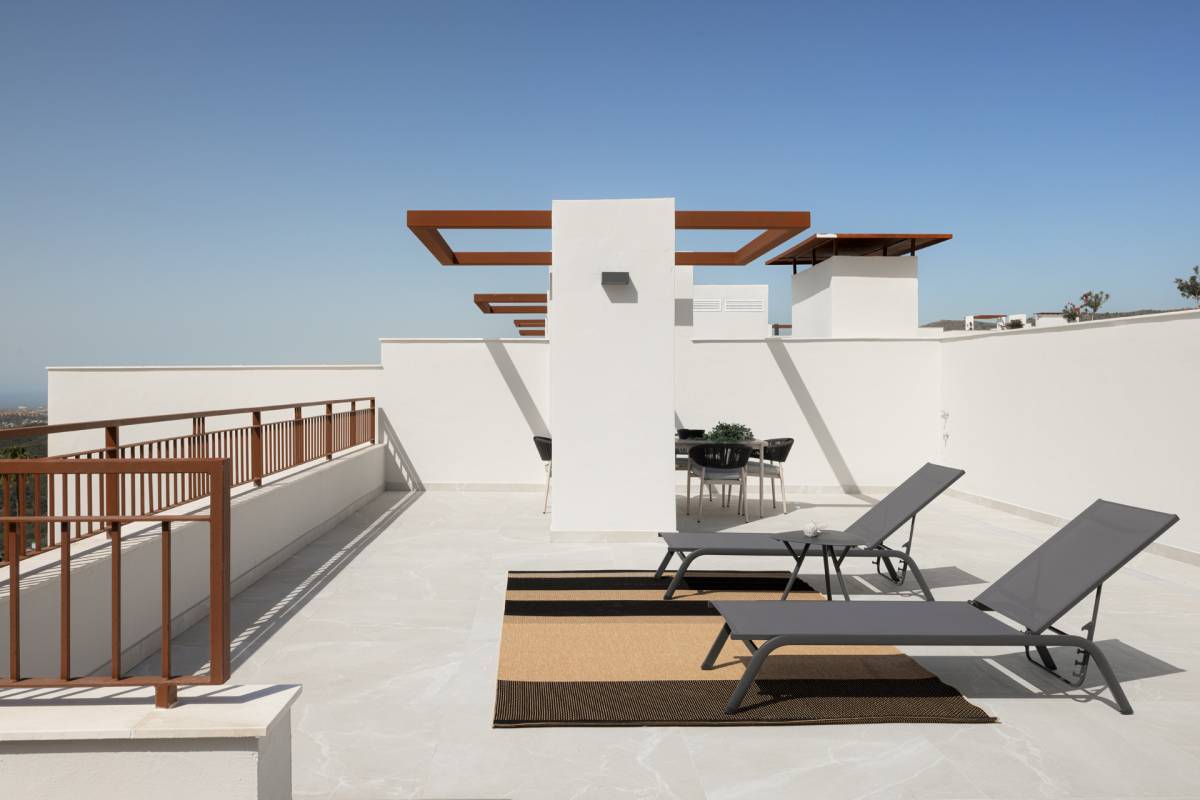 Der Außenbereich dieses Wohnresorts in Cerros del Lago ist so gestaltet, dass er ein perfektes Gleichgewicht zwischen Natur und Komfort bietet. Die Wohnungen verfügen über private Terrassen, die ideal sind, um das mediterrane Klima und den Meerblick zu genießen. Darüber hinaus bieten die Penthäuser ein Solarium, das zusätzlichen Raum für Entspannung und Unterhaltung im Freien bietet. Die Gemeinschaft ist von weitläufigen Gartenanlagen umgeben, die nicht nur die Umgebung verschönern, sondern auch einen ruhigen Raum zum Spazierengehen oder für Aktivitäten im Freien bieten. Die Anwesenheit einer privaten Garage sorgt für Komfort und Sicherheit für die Fahrzeuge der Bewohner.