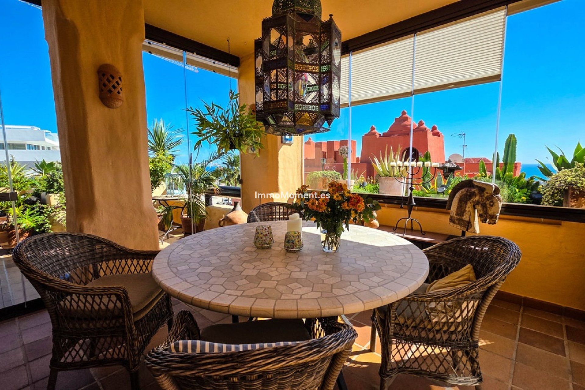 La vivienda dispone de tres dormitorios y dos baños, incluyendo una cocina reformada y un baño actualizado que aportan un estilo más actual al interior. El salón-comedor se abre directamente a una amplia terraza privada, donde las vistas al mar forman parte del día a día. Una parte central de la terraza ha sido cerrada con cortinas de cristal, creando una luminosa extensión del salón que puede disfrutarse durante todo el año, con la posibilidad de abrir completamente el espacio cuando se desee.