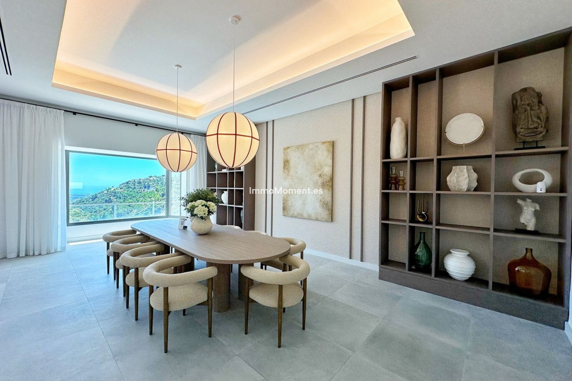 La villa cuenta con una distribución generosa que comienza en un amplio hall de entrada, que da acceso a un luminoso salón abierto, una espaciosa zona de comedor y una cocina moderna. Además, incluye un impresionante despacho de doble altura, todo ello con vistas inigualables a las montañas de El Madroñal y al mar Mediterráneo.