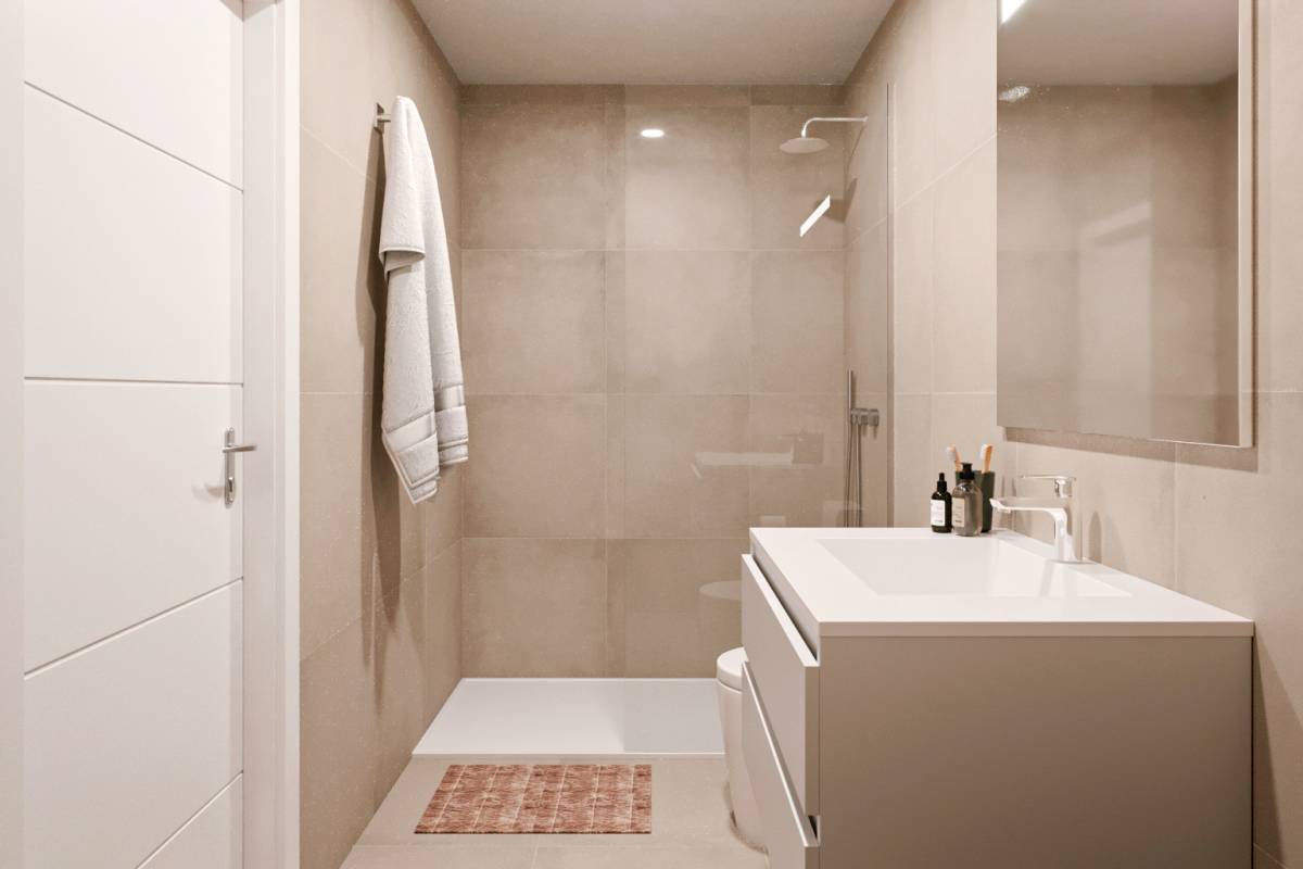 El interior de los bungalows está diseñado para ofrecer un espacio moderno y confortable. Con 2 dormitorios y 2 baños, cada propiedad está equipada para satisfacer las necesidades de una familia o pareja. Los suelos de gres porcelánico aportan un toque de sofisticación y son fáciles de mantener. La cocina está equipada con electrodomésticos modernos, facilitando la vida diaria. Las persianas eléctricas y el videoportero añaden un nivel extra de comodidad y seguridad. El aire acondicionado asegura un ambiente agradable durante todo el año, mientras que los armarios empotrados ofrecen un amplio espacio de almacenamiento.