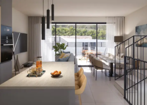 El interior de estos adosados en Fuengirola está pensado para ofrecer el máximo confort y funcionalidad. Con tres dormitorios y cuatro baños, cada vivienda está diseñada para satisfacer las necesidades de familias modernas. Los electrodomésticos de última generación y los armarios empotrados aseguran que cada espacio sea práctico y eficiente. El videoportero añade un nivel adicional de seguridad y comodidad, permitiendo controlar el acceso al hogar de manera sencilla. La distribución de los espacios interiores está cuidadosamente planificada para ofrecer un ambiente acogedor y funcional, donde cada miembro de la familia puede disfrutar de su propio espacio.