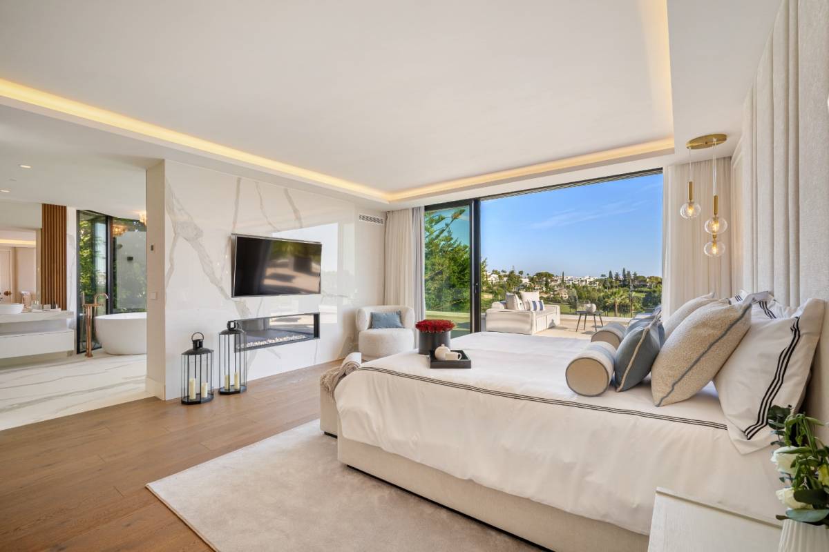 En el interior, la villa ofrece un diseño espacioso y funcional con seis dormitorios y seis baños, proporcionando un amplio espacio para familias numerosas o para recibir invitados. Los armarios empotrados en las habitaciones aseguran un almacenamiento eficiente y ordenado. La distribución incluye un garaje, lo que añade comodidad y seguridad para los vehículos de los residentes.