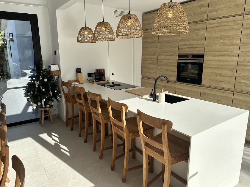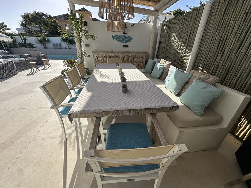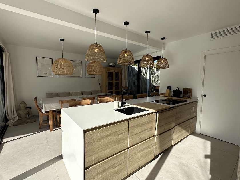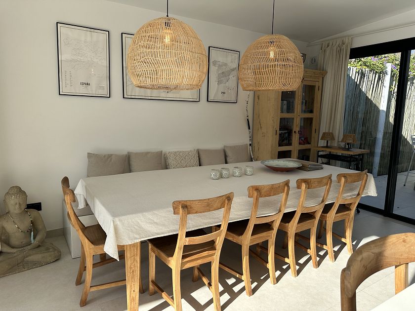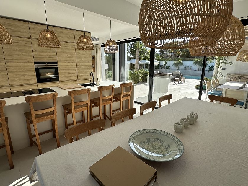 Les grandes fenêtres du salon et de la cuisine ouverte sur la salle à manger donnent sur cette oasis de paix avec accès à la piscine et une table à manger pour 10 personnes, une touche supplémentaire est le barbecue à feu où vous pouvez profiter de la façon tendance de manger.