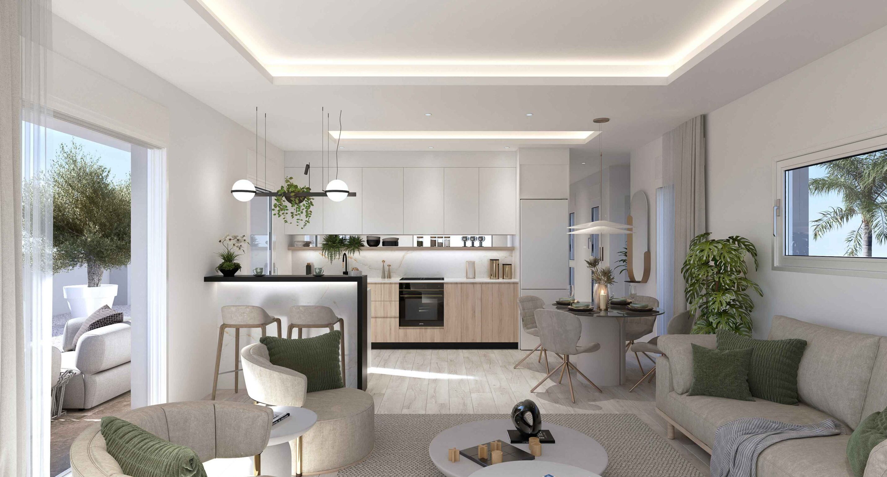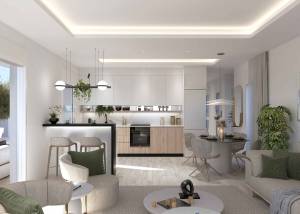 Les résidences sont équipées de sols en grès cérame, apportant une touche moderne et élégante à chaque espace. La distribution intérieure comprend des options de 2 et 3 chambres, toutes avec placards intégrés, et 2 salles de bains complètes. La pré-installation de la climatisation assure le confort tout au long de l'année. De plus, chaque propriété dispose d'un système de vidéophone, garantissant sécurité et commodité. La cuisine et le salon sont conçus pour offrir un espace ouvert et lumineux, idéal pour le quotidien.
