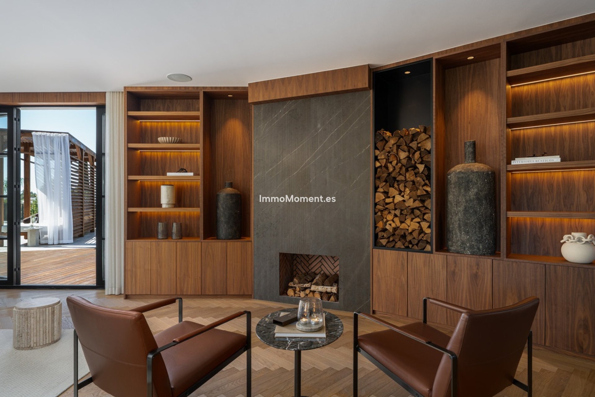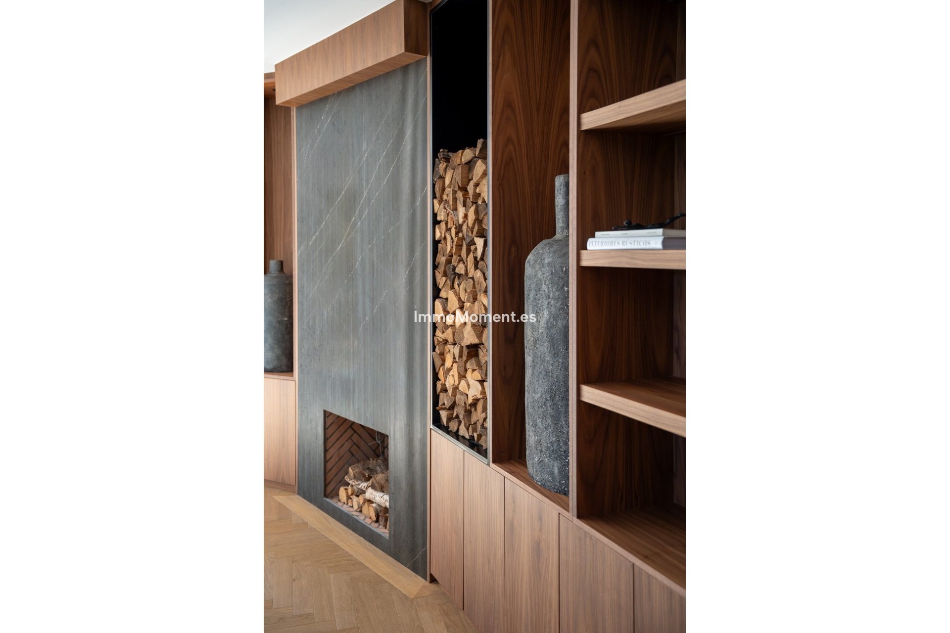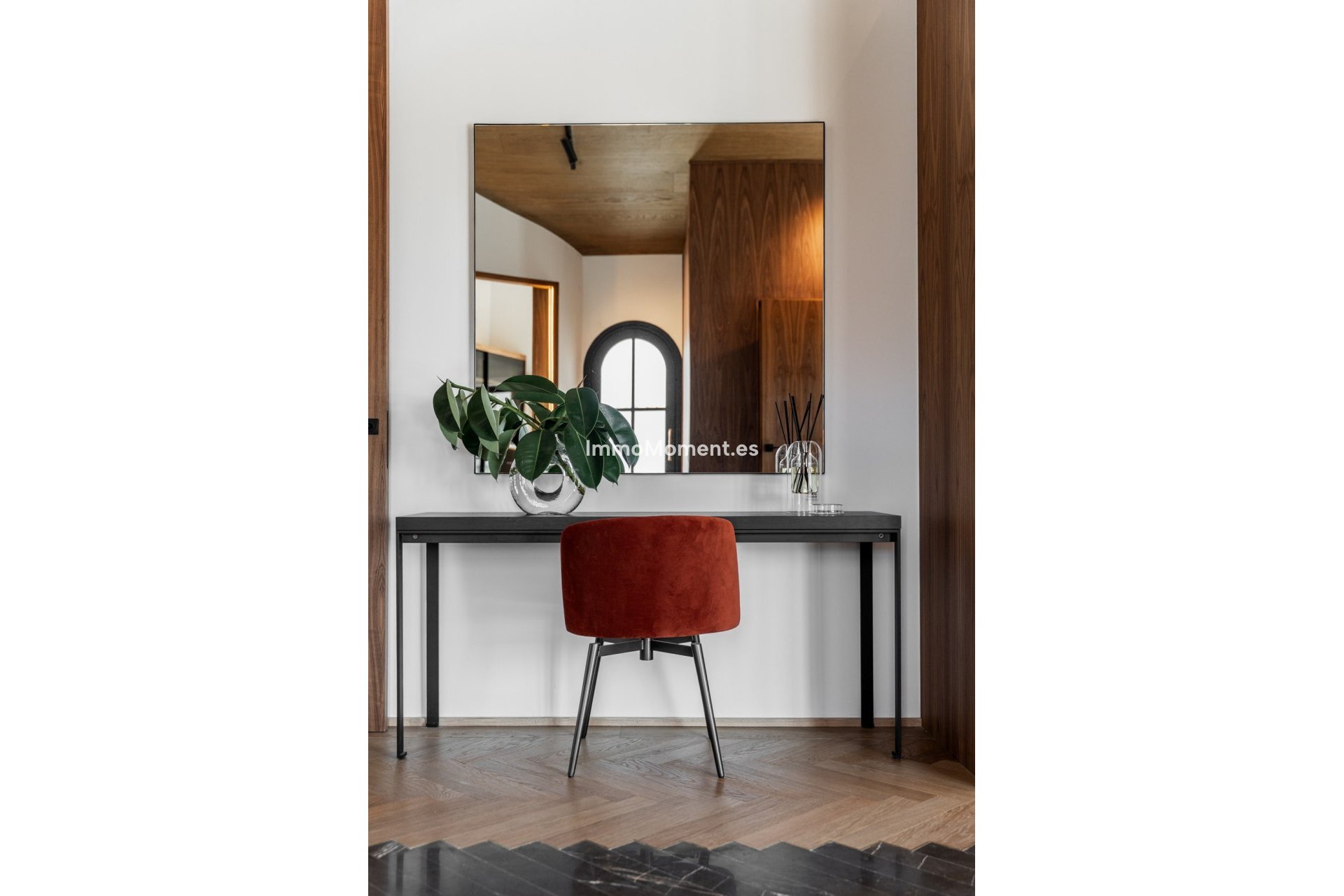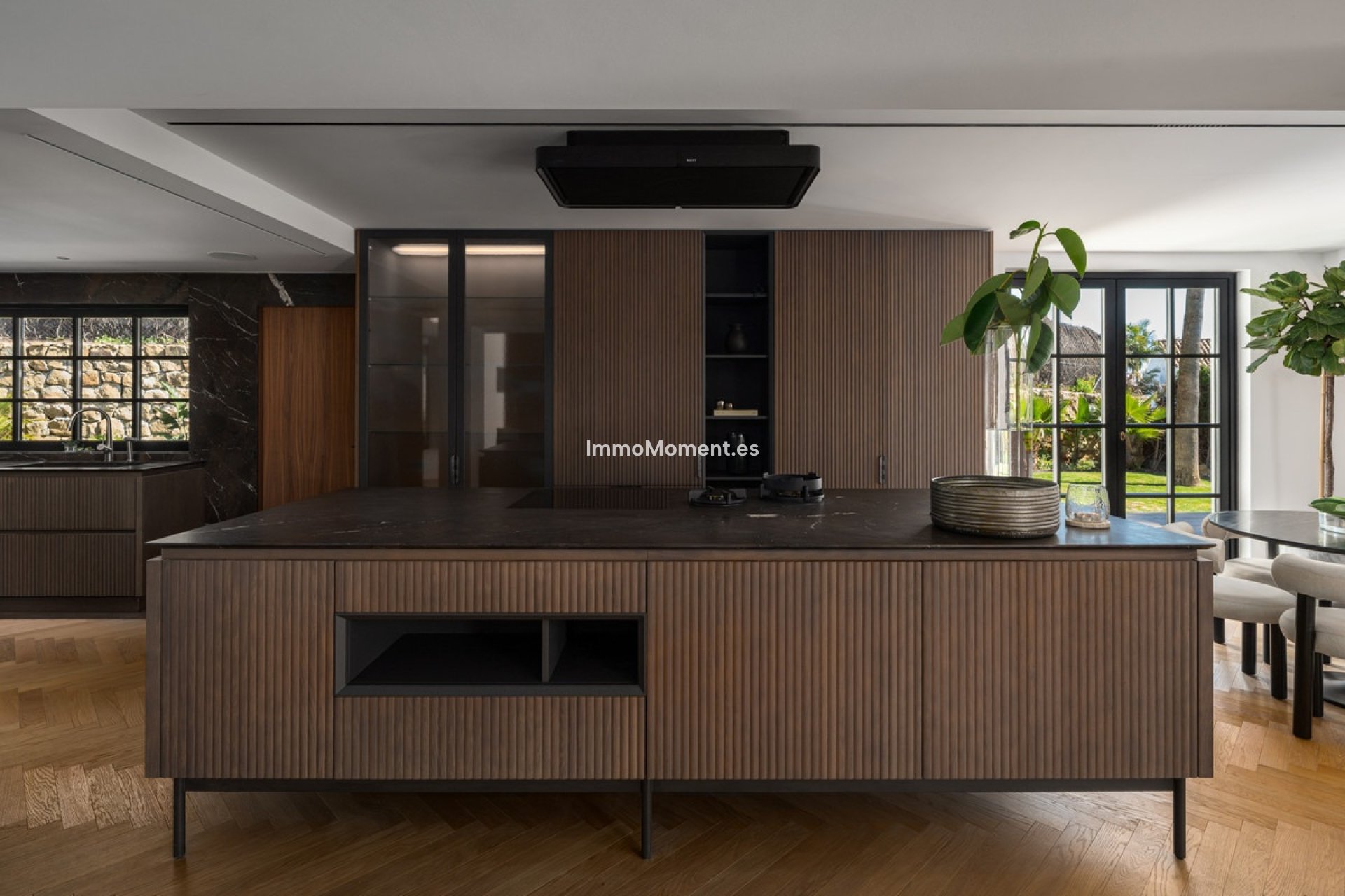 Ce n'est pas une villa classique de la Golf Valley. Elle a été repensée selon une ligne architecturale claire, où proportions, matériaux et circulation ont été soigneusement étudiés. Dès l'entrée, le niveau de détail est perceptible : parquet en chêne en chevrons, menuiseries sur mesure en noyer, façades cannelées et marbre veiné foncé, le tout assemblé avec cohérence et maîtrise.