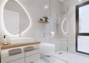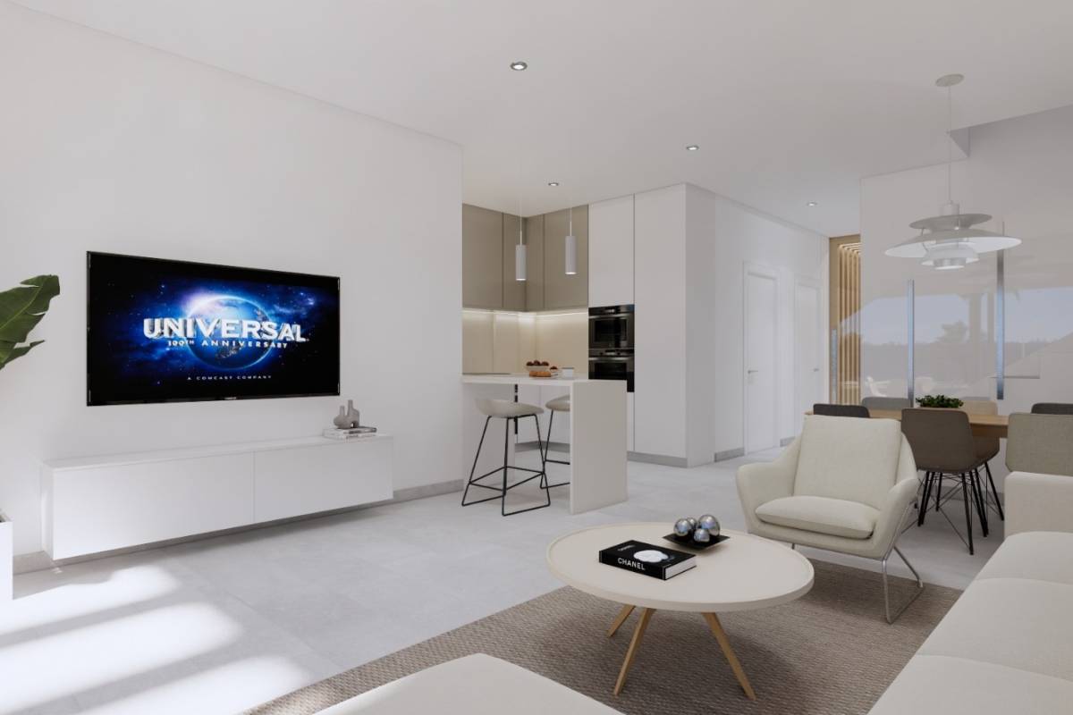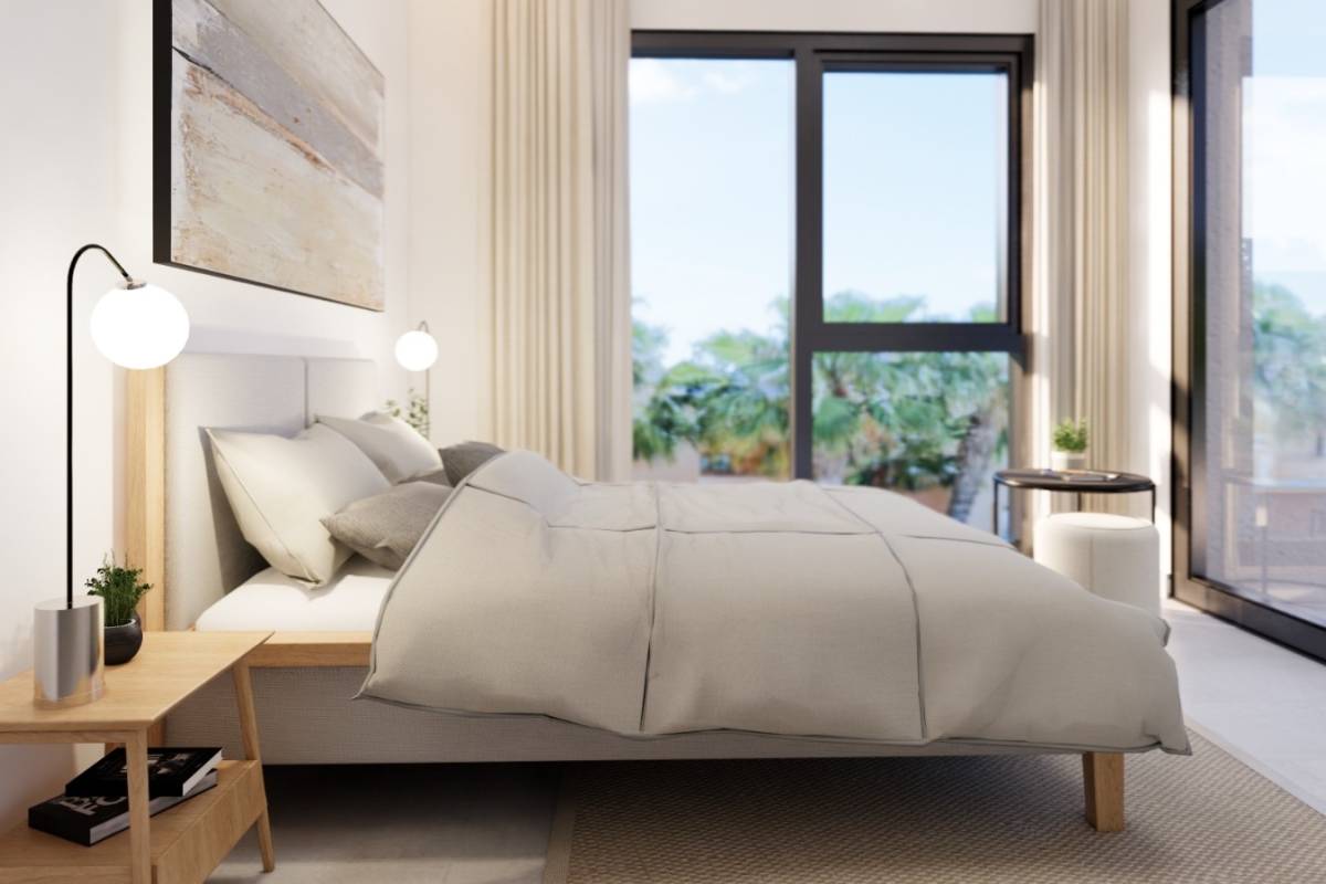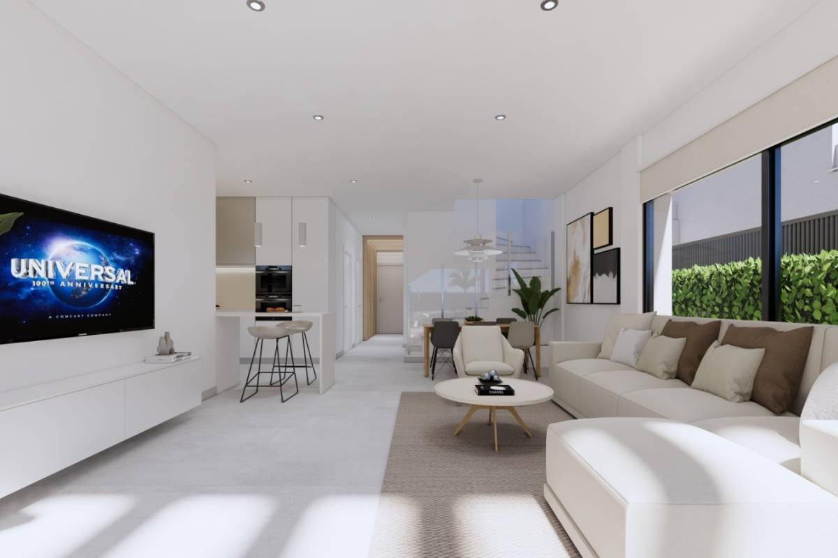 Het interieur van de rijtjeshuizen is zorgvuldig ontworpen om maximaal comfort te bieden. Met een indeling die 3 slaapkamers en 3 badkamers omvat, is elke ruimte geoptimaliseerd voor het moderne leven. De porseleinen tegelvloeren geven een vleugje elegantie en duurzaamheid. De woningen zijn uitgerust met airconditioning, elektrische rolluiken en apparaten, wat zorgt voor een comfortabele en functionele omgeving. Ingebouwde kasten bieden efficiënte opslag, waardoor de ruimtes netjes en rommelvrij blijven.