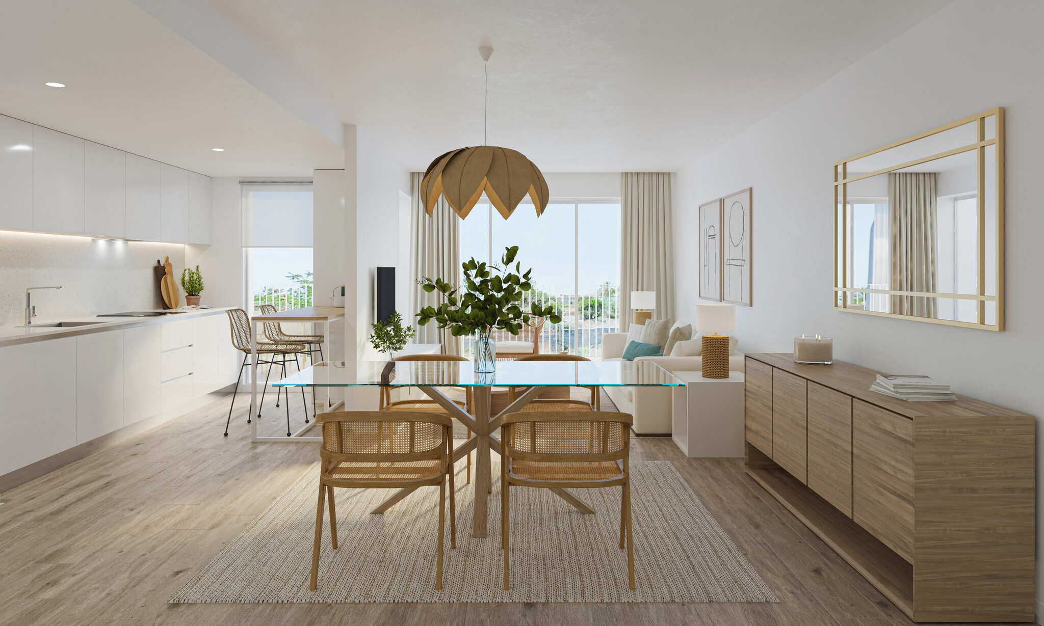 De woningen zijn uitgerust met moderne kenmerken die zorgen voor een comfortabele en functionele leefervaring. De interieurs hebben keramische vloeren, die een elegante uitstraling geven en gemakkelijk te onderhouden zijn. De klimaatregeling is gegarandeerd dankzij airconditioning en de pre-installatie van extra systemen. Elektrische rolluiken en inbegrepen apparaten maken het dagelijks leven gemakkelijker, terwijl ingebouwde kasten efficiënte opslag bieden. De indelingsopties variëren van 1 tot 4 slaapkamers en van 1 tot 3 badkamers, aangepast aan verschillende gezinsbehoeften.