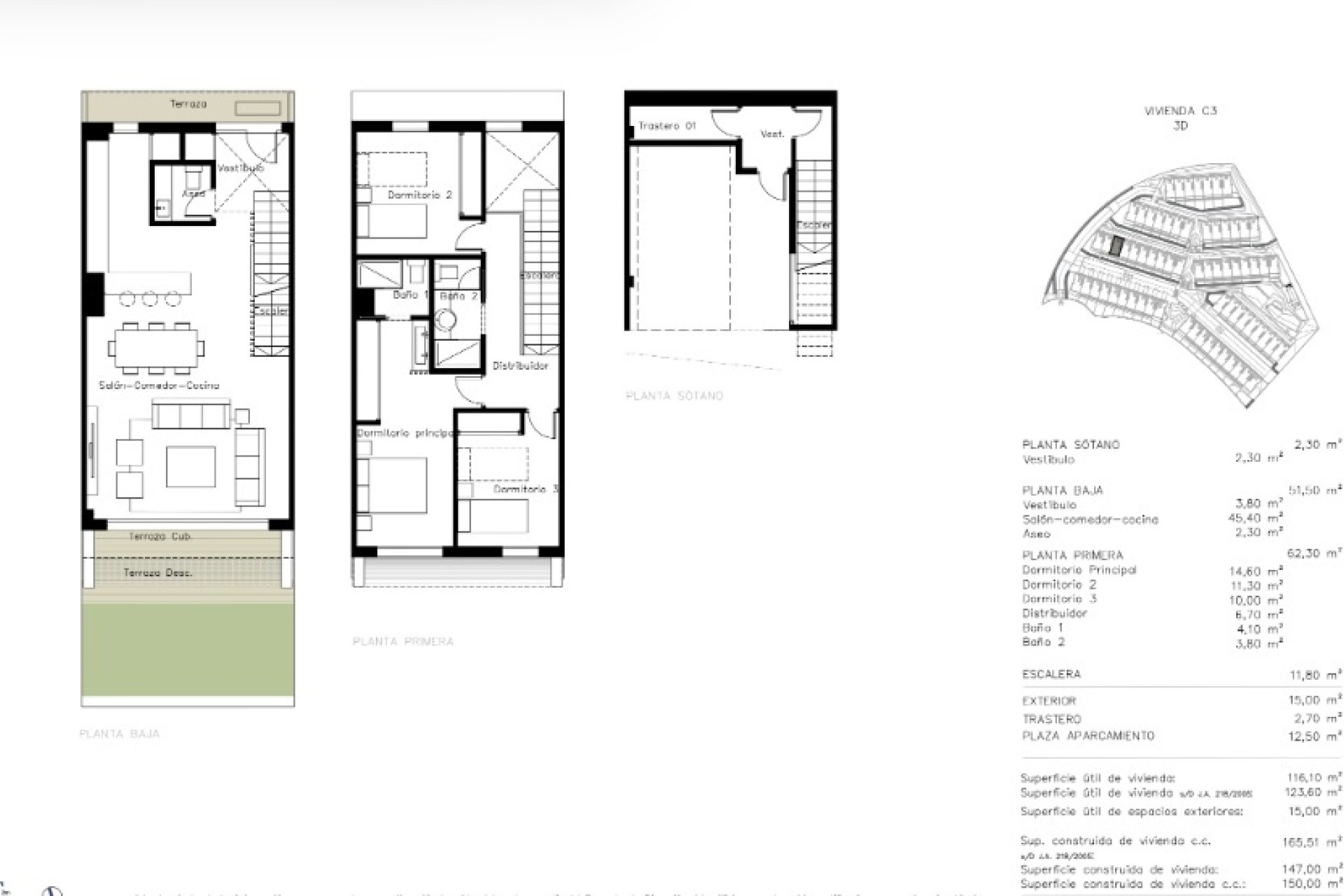 The exteriors of these townhouses stand out for their contemporary and functional design. Each home features a private garden, ideal for enjoying outdoor moments with family or friends. The terrace, a perfect space for relaxation, offers sea views, creating a serene and exclusive atmosphere. Additionally, some homes have a private pool, providing a touch of luxury and privacy. The exterior architecture is complemented by high-quality materials, ensuring durability and aesthetics in every detail.