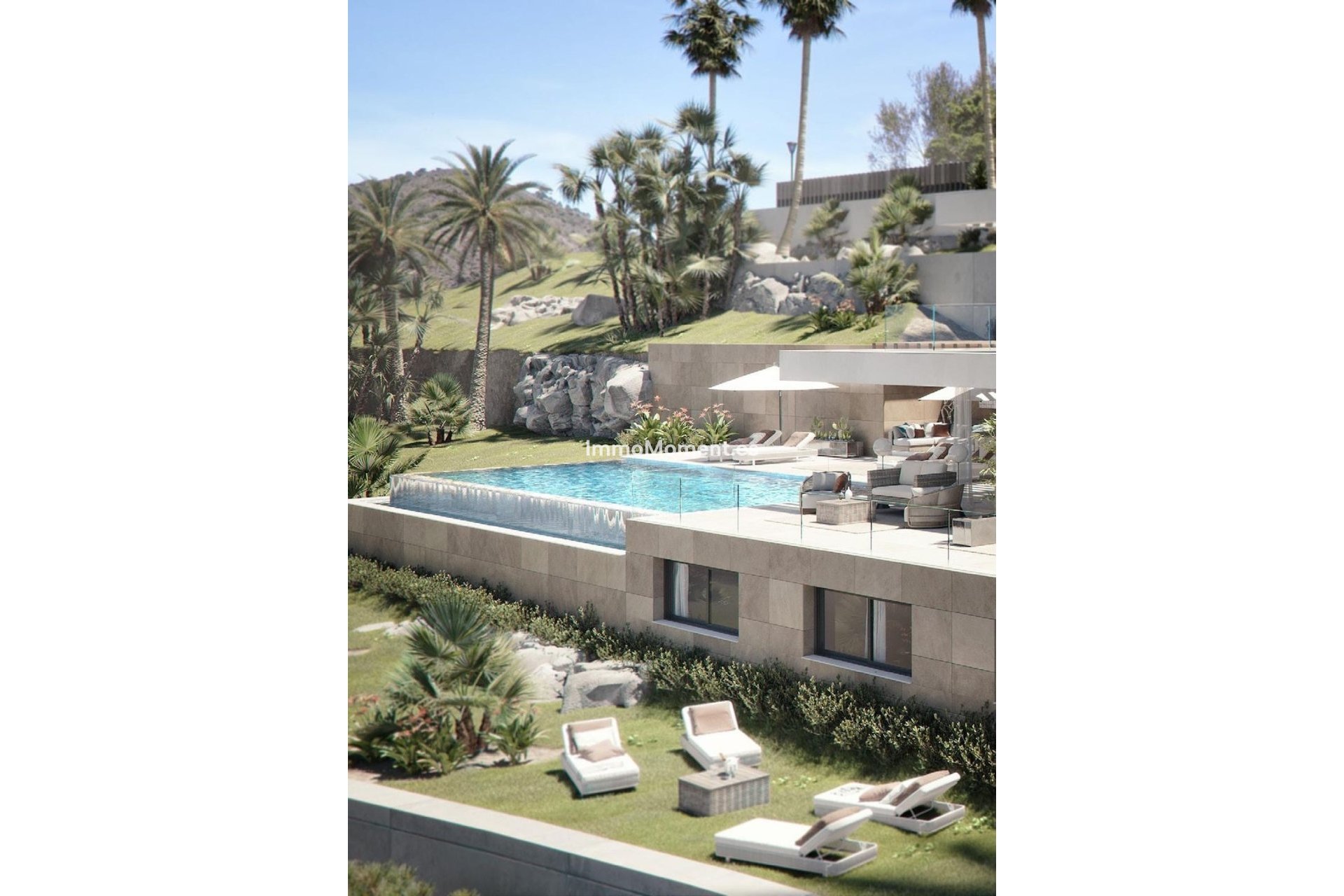 The original design offers a total build size of 440m2, of which covered terraces are 164m2, uncovered terraces 310m2, a pool of 51m2, a garage of 45m2 iand nterior built surface. of 258m2