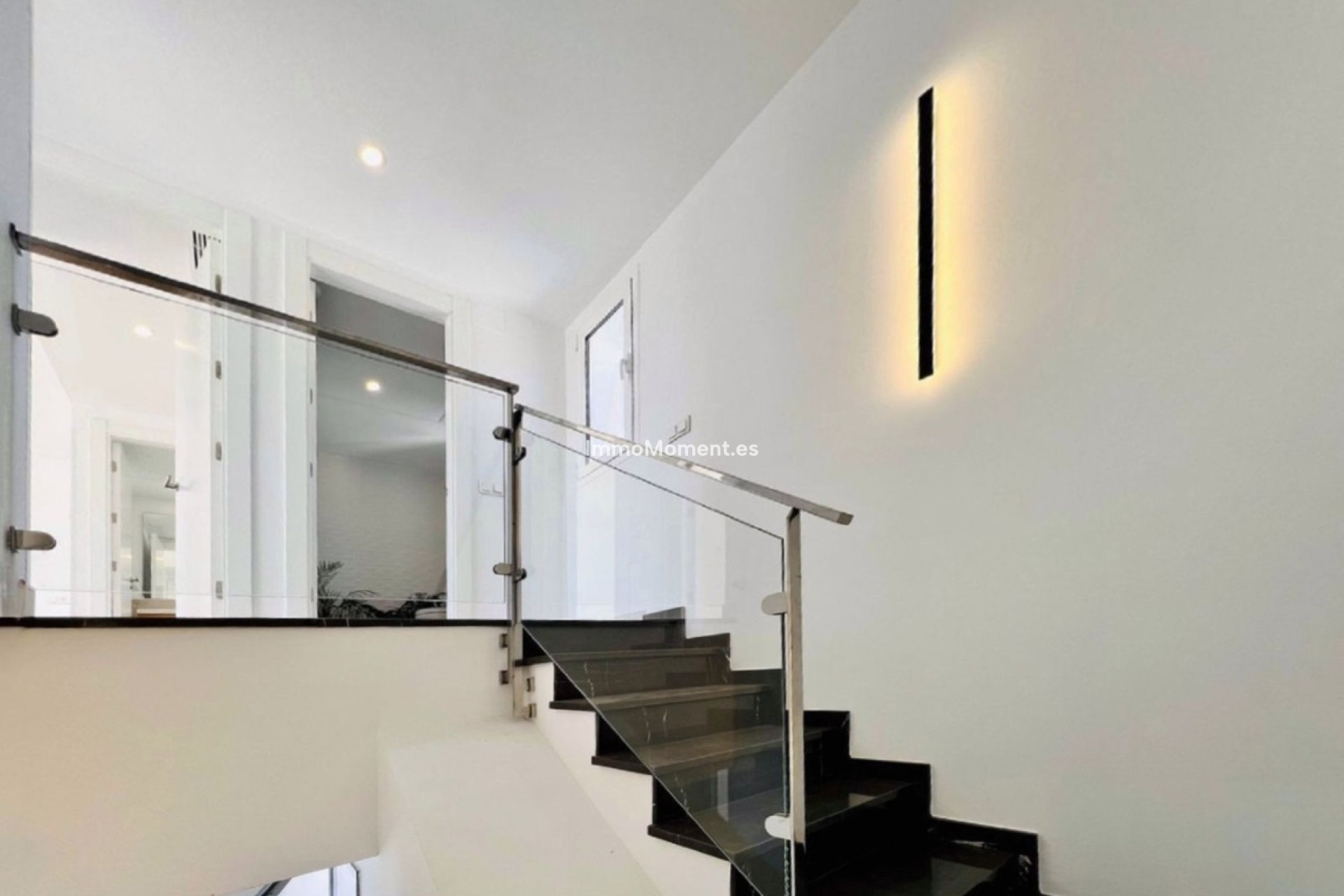 A sophisticated modern stairway leads us upstairs, where we find the master bedroom with its stunning en-suite bathroom, a luxe and inviting space with tons of natural light. There is also an equally bright second guest bedroom and an additional bathroom. All rooms come with ample built-in closets. On that same level, we find a second terrace, perfect for sunbathing, since it is perfectly private, and where one can enjoy a snack while enjoying the wonderful views.
