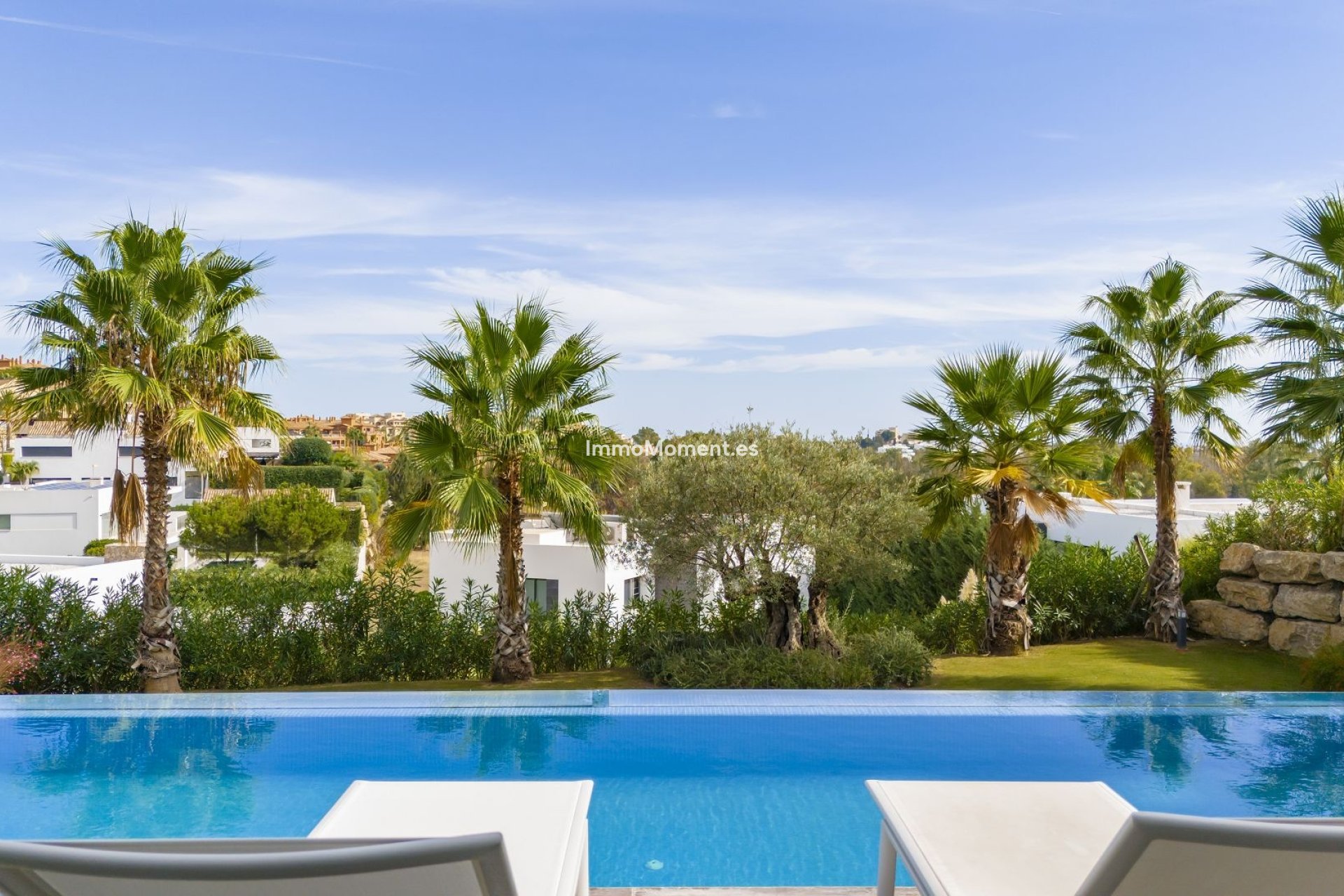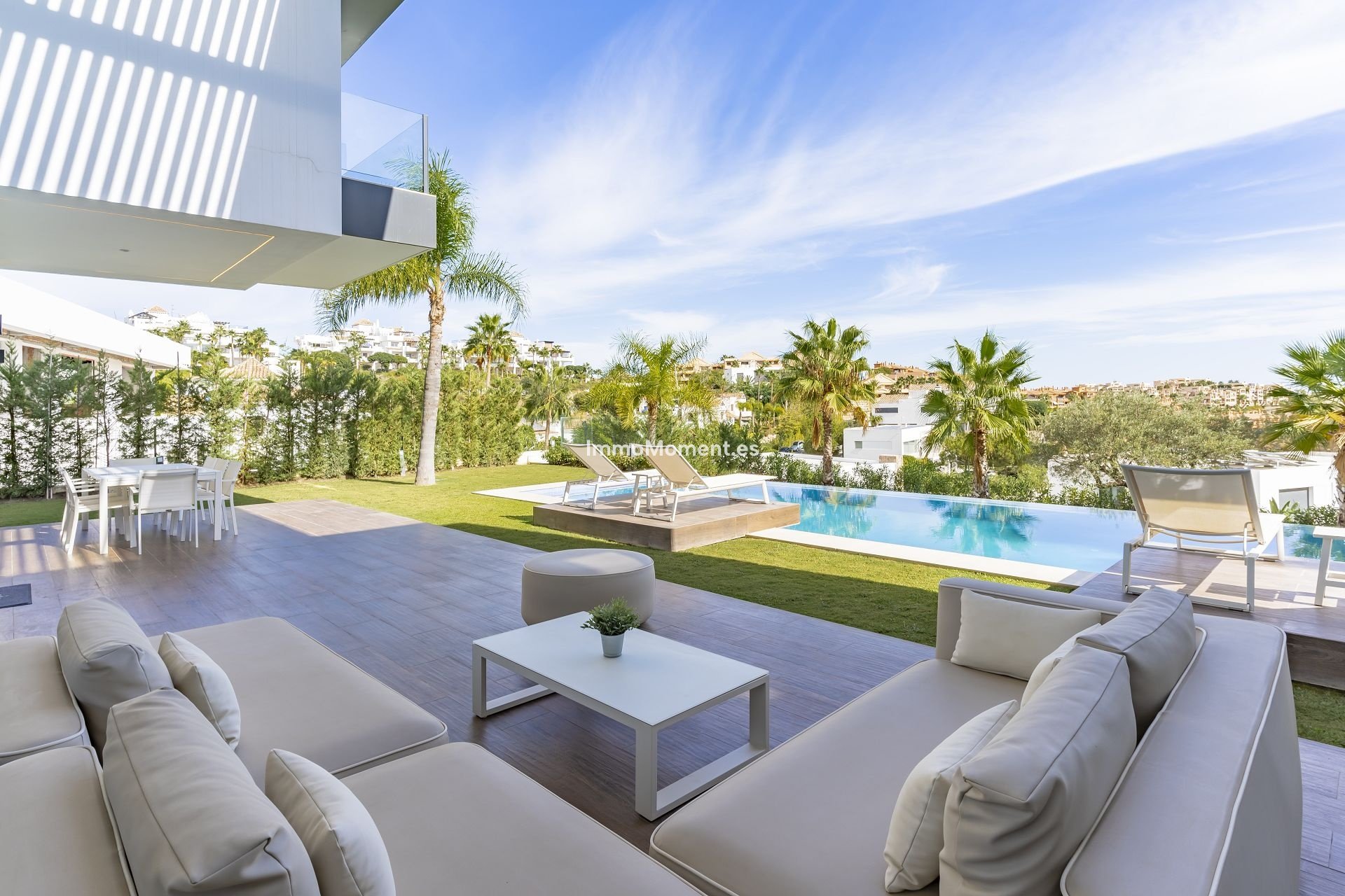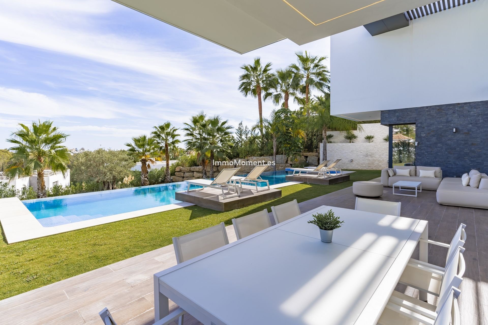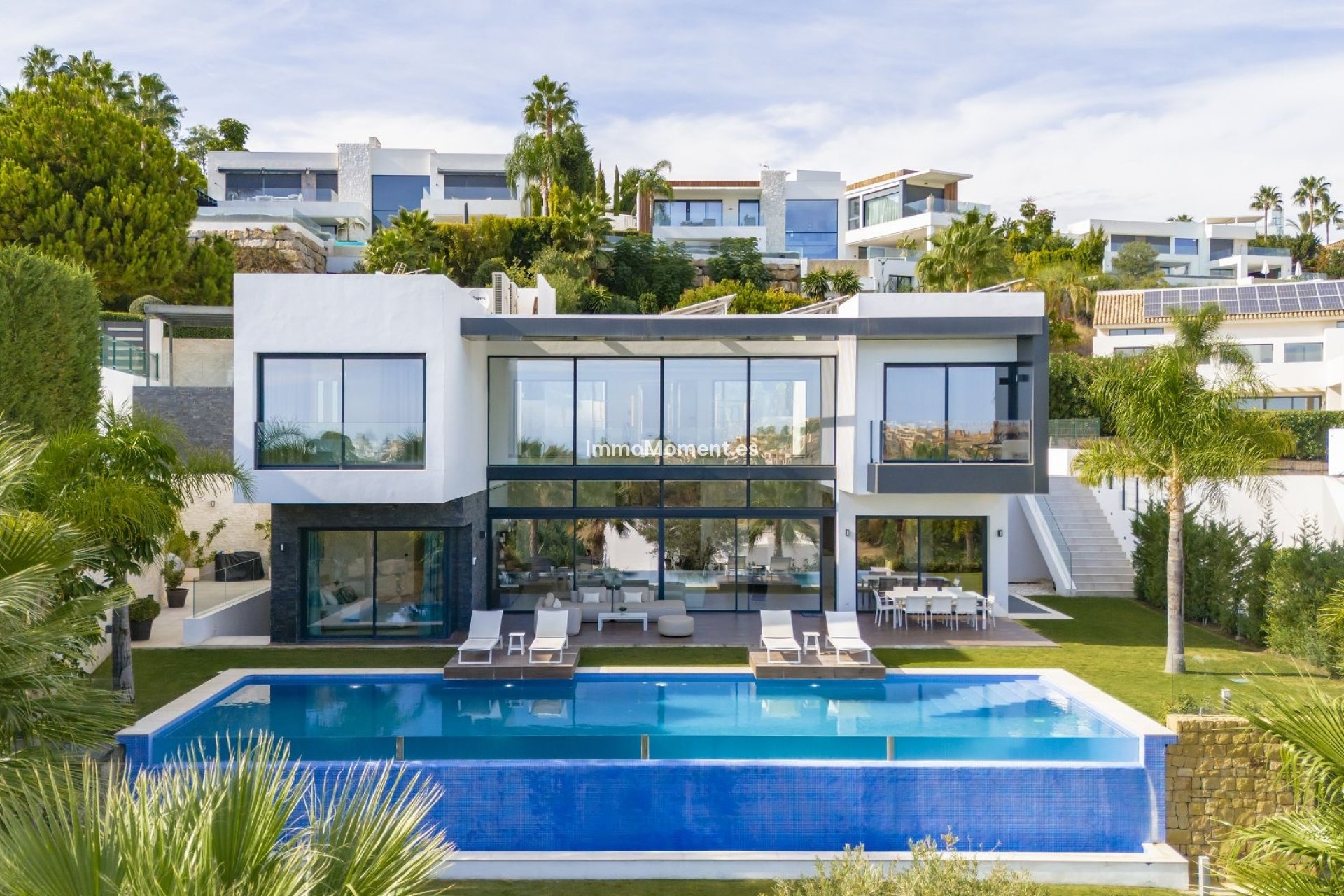 - Infinity-Pool im Freien mit Glaswand - Südlage mit Blick auf den Golfplatz und teilweise auf das Meer - Terrasse mit Sonnenliegen, Essbereich und Sofas im Freien - Kinoraum mit Projektor und Apple TV - Spielebereich (Billard) - Designermöbel - Gasgrill im Freien - voll ausgestattete Küche mit Gaggenau-Geräten - Waschküche - Alarmanlage - High-Speed-Internet mit WiFi - Klimaanlage und Fußbodenheizung - Gemeinschaft mit 24-Stunden-Sicherheit - Nähe zum Golf - Privatparkplatz für 3 Autos