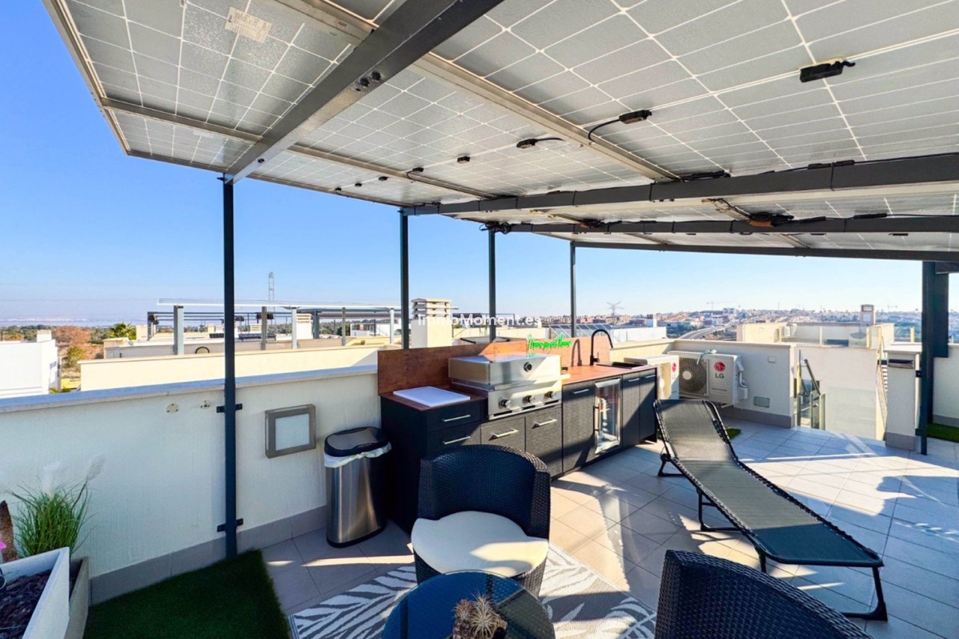 Im ersten Stock befinden sich zwei große Schlafzimmer mit Einbauschränken und schöner Aussicht auf den Außenbereich. Abgerundet wird die Etage durch ein weiteres Vollbad mit modernem und funktionalem Design. Von dieser Etage aus haben Sie Zugang zu einem spektakulären, 37 m² großen privaten Solarium mit einem Essbereich, einer Schatten spendenden Pergola und einer neu installierten Sommerküche – perfekt, um sonnige Tage und Abende im Freien zu genießen.