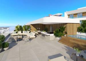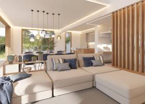 Das Innere der Villen ist so gestaltet, dass es einen funktionalen und eleganten Raum bietet. Mit vier Schlafzimmern, jedes mit Einbauschränken, und vier Bädern sind die Wohnungen darauf ausgelegt, die Bedürfnisse einer modernen Familie zu erfüllen. Die Fußbodenheizung sorgt für eine warme Atmosphäre in den kälteren Monaten. Große Fenster lassen natürliches Licht herein, wodurch eine helle und einladende Atmosphäre entsteht. Die Raumaufteilung umfasst offene Bereiche, die die Wohnbereiche mit den Terrassen verbinden und einen fließenden Lebensstil zwischen Innen- und Außenbereich ermöglichen.