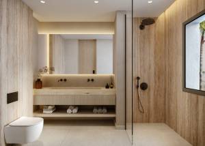 Das Innere dieser Reihenhäuser ist so gestaltet, dass es maximalen Komfort und Modernität bietet. Mit drei Schlafzimmern und drei Bädern ist jede Immobilie mit Feinsteinzeugböden ausgestattet, die einen eleganten und pflegeleichten Touch verleihen. Elektrische Rollläden und das Smart-Home-System verbessern den Komfort und die Energieeffizienz. Die Küche ist mit modernen Geräten ausgestattet, und die Klimaanlage sorgt das ganze Jahr über für ein angenehmes Ambiente. Einbauschränke bieten viel Stauraum, während die Fußbodenheizung in den kälteren Monaten für Wärme sorgt.