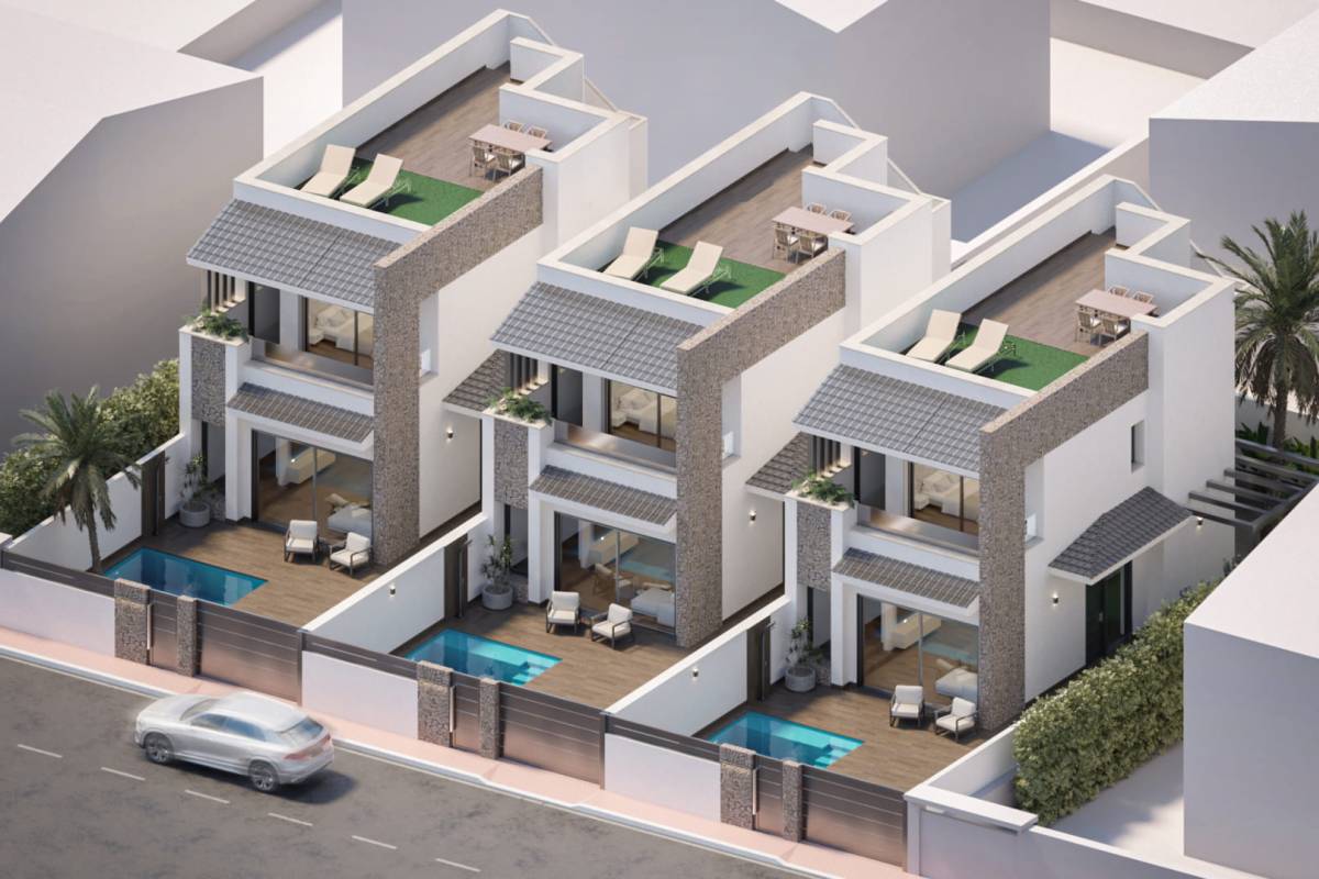 In der charmanten Stadt San Pedro del Pinatar gelegen, bieten diese Reihenhäuser eine einzigartige Gelegenheit, das Leben an der Küste zu genießen. Mit einem modernen und funktionalen Design ist jede Immobilie darauf ausgelegt, den Komfort und die Bequemlichkeit der Bewohner zu maximieren. Die Nähe zum Meer, nur 3 km entfernt, ermöglicht es, die Meeresbrise und angenehme Strandspaziergänge zu genießen. Zudem befindet sich der Flughafen nur 8 km entfernt, was den Zugang und die Mobilität erleichtert. Dieses Ensemble von drei Reihenhäusern besticht durch seine strategische Lage, ideal für diejenigen, die eine ruhige Umgebung suchen, ohne auf städtische Annehmlichkeiten zu verzichten.