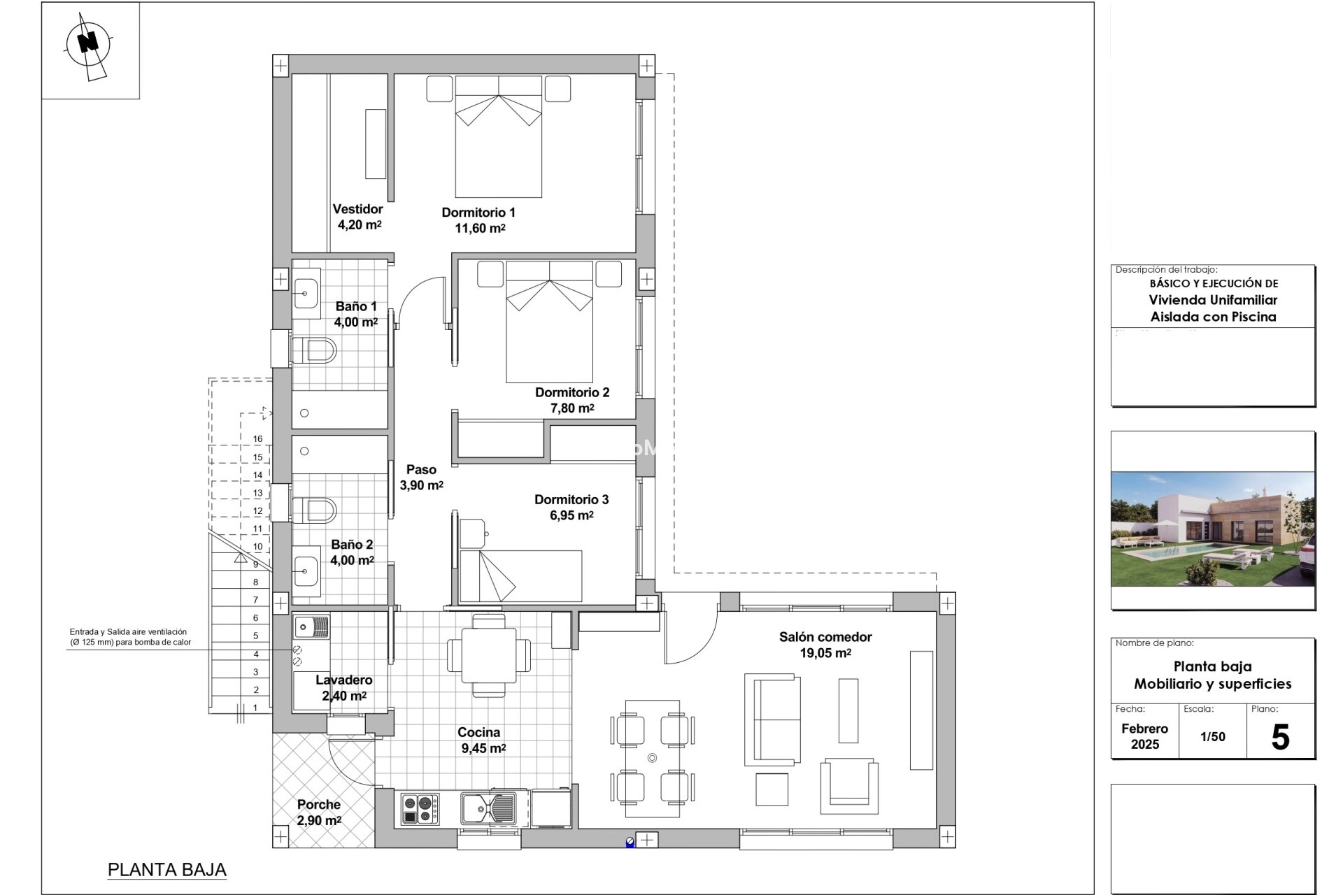 El interior de la villa está cuidadosamente diseñado para ofrecer un ambiente acogedor y funcional. El suelo de gres porcelánico no solo es elegante, sino también fácil de mantener, lo que lo convierte en una opción práctica para el día a día. La distribución de los espacios está pensada para ofrecer comodidad y privacidad, con tres dormitorios que permiten acomodar a toda la familia o a invitados. Los dos baños están equipados para satisfacer las necesidades diarias con estilo y eficiencia. La preinstalación de aire acondicionado asegura que cada habitación pueda mantenerse a una temperatura agradable durante todo el año.