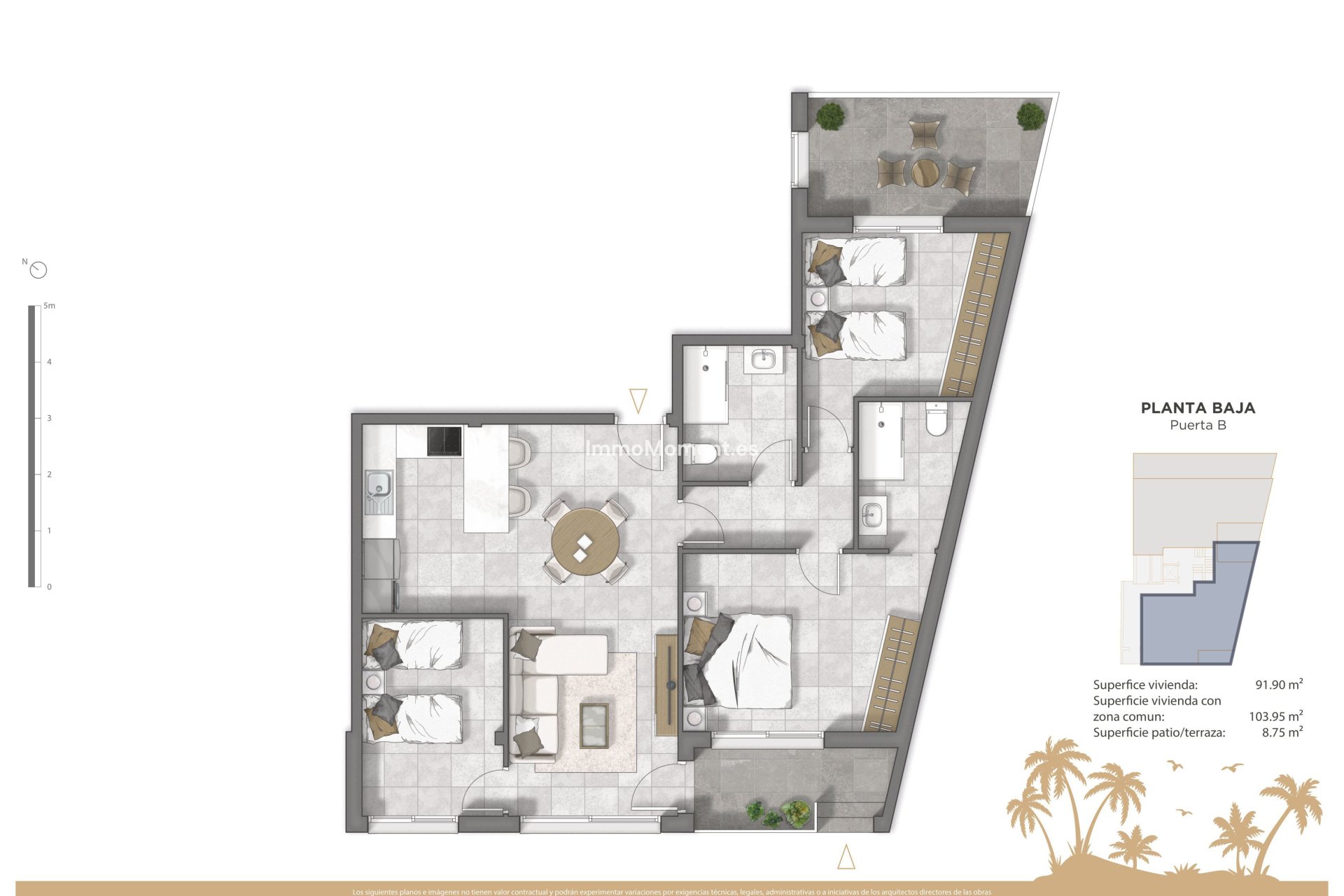 El interior de las viviendas está diseñado para ofrecer confort y elegancia. Con opciones de 2 o 3 dormitorios y 2 baños, cada propiedad está pensada para adaptarse a diferentes necesidades familiares. Los suelos de cerámica aportan un toque contemporáneo y son fáciles de mantener, mientras que los armarios empotrados ofrecen un almacenamiento eficiente. La inclusión de electrodomésticos modernos asegura que cada cocina esté lista para su uso desde el primer día. Las distribuciones están cuidadosamente planificadas para maximizar el espacio y la luz natural, creando ambientes acogedores y funcionales.
