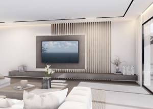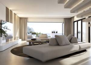 El interior de la villa está cuidadosamente diseñado con acabados de alta calidad. Los suelos de gres porcelánico aportan un toque moderno y elegante. La villa está completamente amueblada, lista para entrar a vivir. Dispone de cuatro dormitorios y cuatro baños, ofreciendo un espacio amplio y cómodo para toda la familia. La cocina está equipada con electrodomésticos de última generación, y el sistema de domótica garantiza un control total de las funciones del hogar. Los armarios empotrados ofrecen un almacenamiento eficiente y discreto.