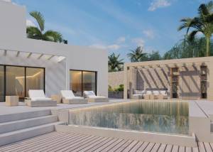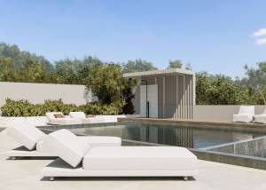 El exterior de la villa está diseñado para el máximo disfrute y relajación. Cuenta con una piscina privada, ideal para refrescarse durante los cálidos días de verano. La presencia de una pérgola añade un toque de elegancia y proporciona un espacio sombreado perfecto para reuniones al aire libre. Además, el jacuzzi ofrece un lugar ideal para relajarse y disfrutar de las vistas del entorno natural.
