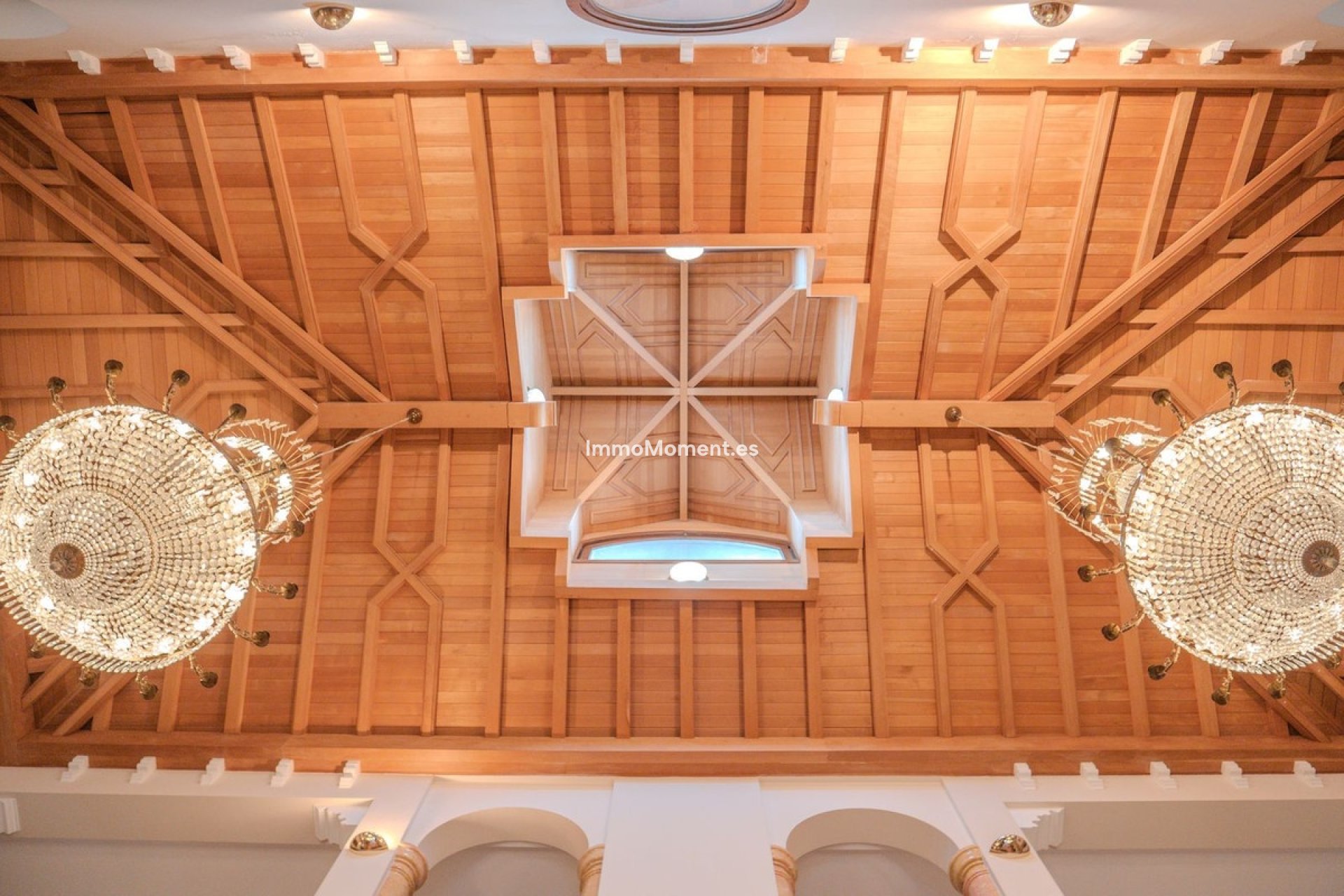 Dès l'entrée par les portails électriques doubles, la grandeur s'impose. La propriété dispose de deux accès indépendants, garantissant confidentialité et praticité. À l'intérieur, des plafonds de 11 mètres de haut, un travail du bois sur mesure et des escaliers en marbre soulignent l'élégance et l'harmonie architecturale intemporelle.