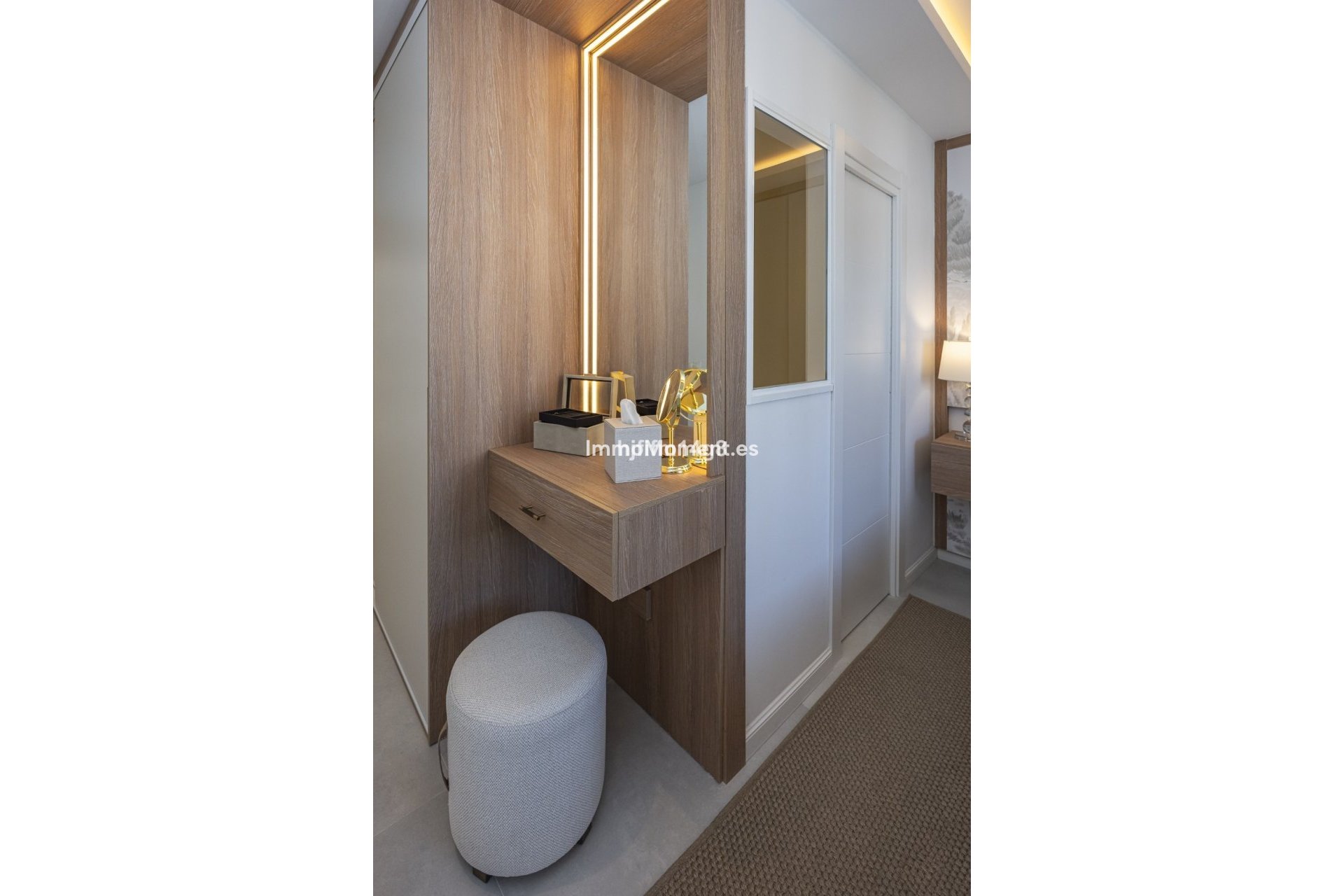 À l'étage supérieur se trouvent une élégante suite parentale avec salle de bains privative et une chambre d'amis également dotée de sa propre salle de bains. Ces espaces disposent de dressings sur mesure et de meubles de salle de bains personnalisés, avec des finitions raffinées, notamment des tables de chevet en travertin dans la chambre en face de la suite parentale. Toutes les salles de bains sont équipées de carreaux XXL, tandis que les toilettes invités présentent de magnifiques carreaux de porcelaine texturés haut de gamme.