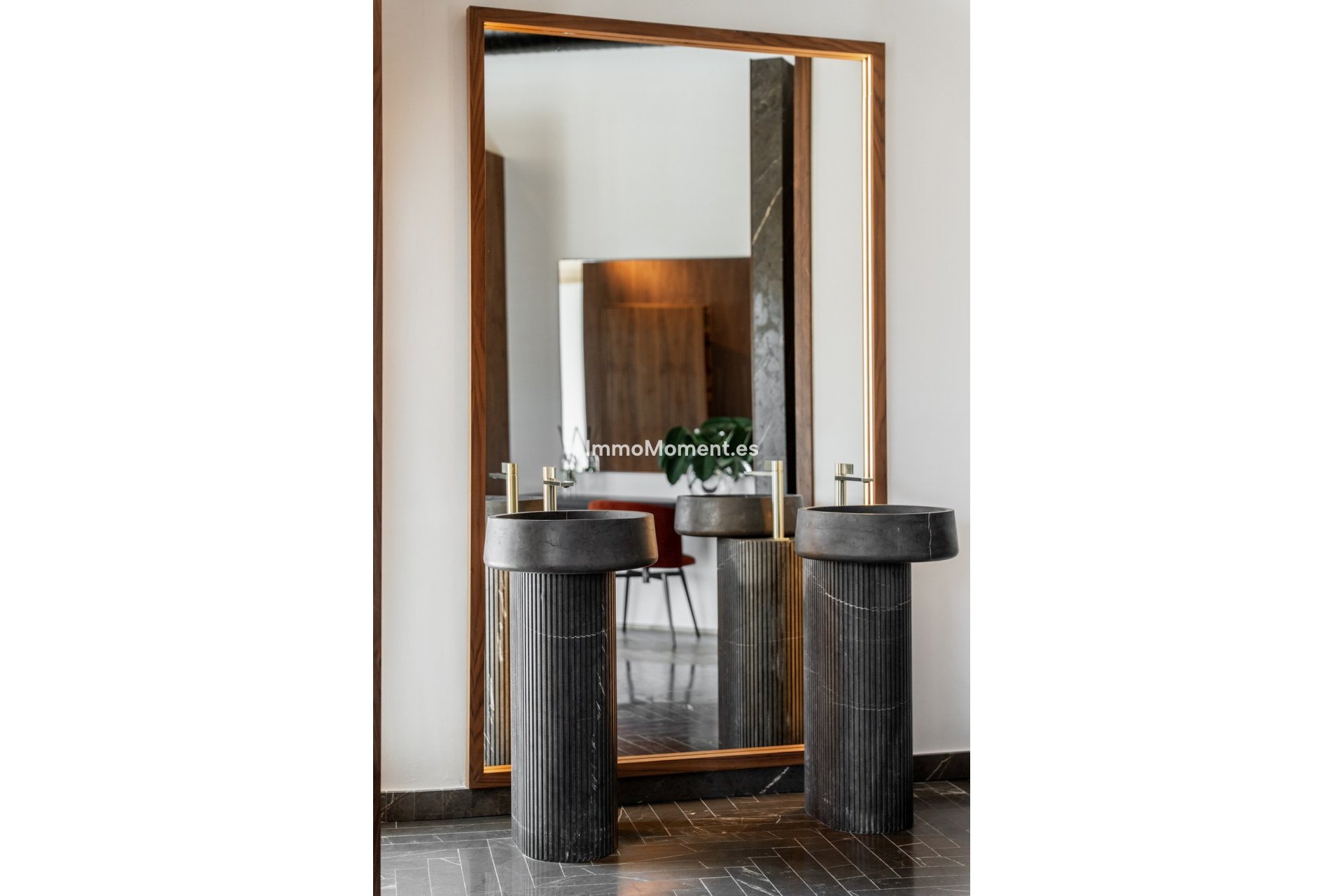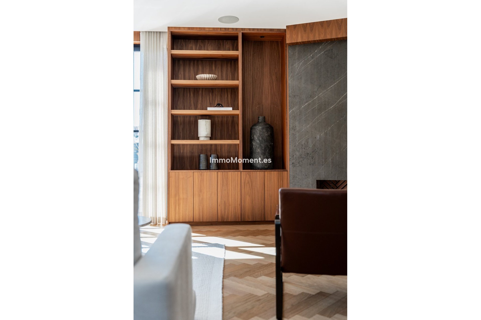 Ce n'est pas une villa classique de la Golf Valley. Elle a été repensée selon une ligne architecturale claire, où proportions, matériaux et circulation ont été soigneusement étudiés. Dès l'entrée, le niveau de détail est perceptible : parquet en chêne en chevrons, menuiseries sur mesure en noyer, façades cannelées et marbre veiné foncé, le tout assemblé avec cohérence et maîtrise.