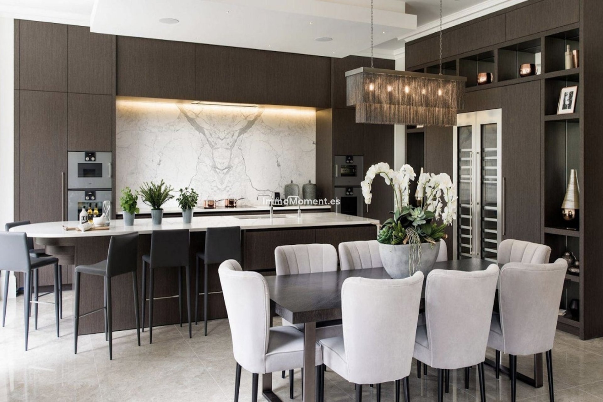 Begane grond; dubbelhoge entree, lift, gastentoilet, grote woon-/eetkamer met open keuken, wasruimte, schoenenkleedkamer en kantoorruimte die kan worden omgezet in een slaapkamer met badkamer.