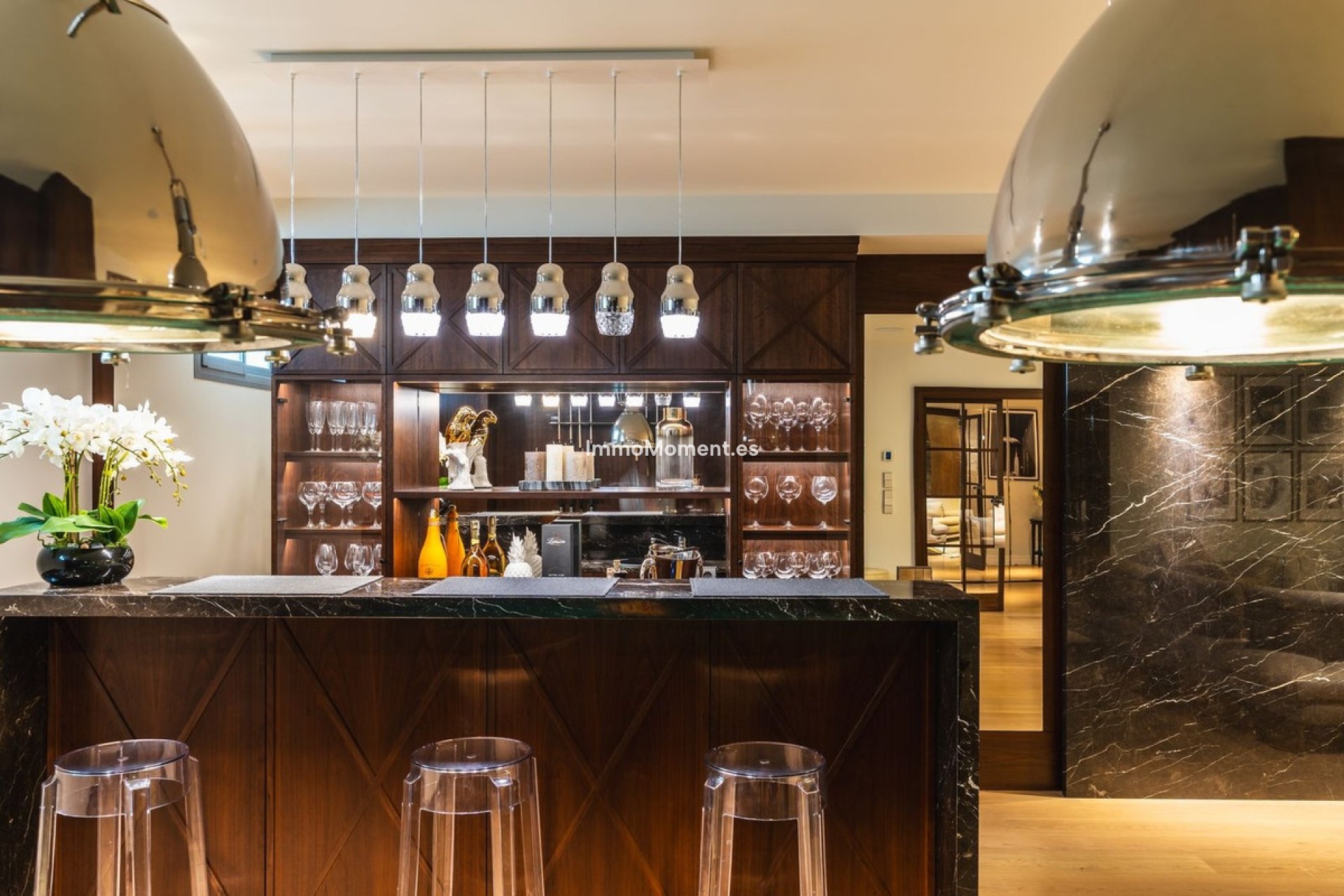 The lower level is an entertainment area with an elegant bar, a TV area, a pool table and a fully equipped gym. There is also a bathroom, a laundry room and a garage.