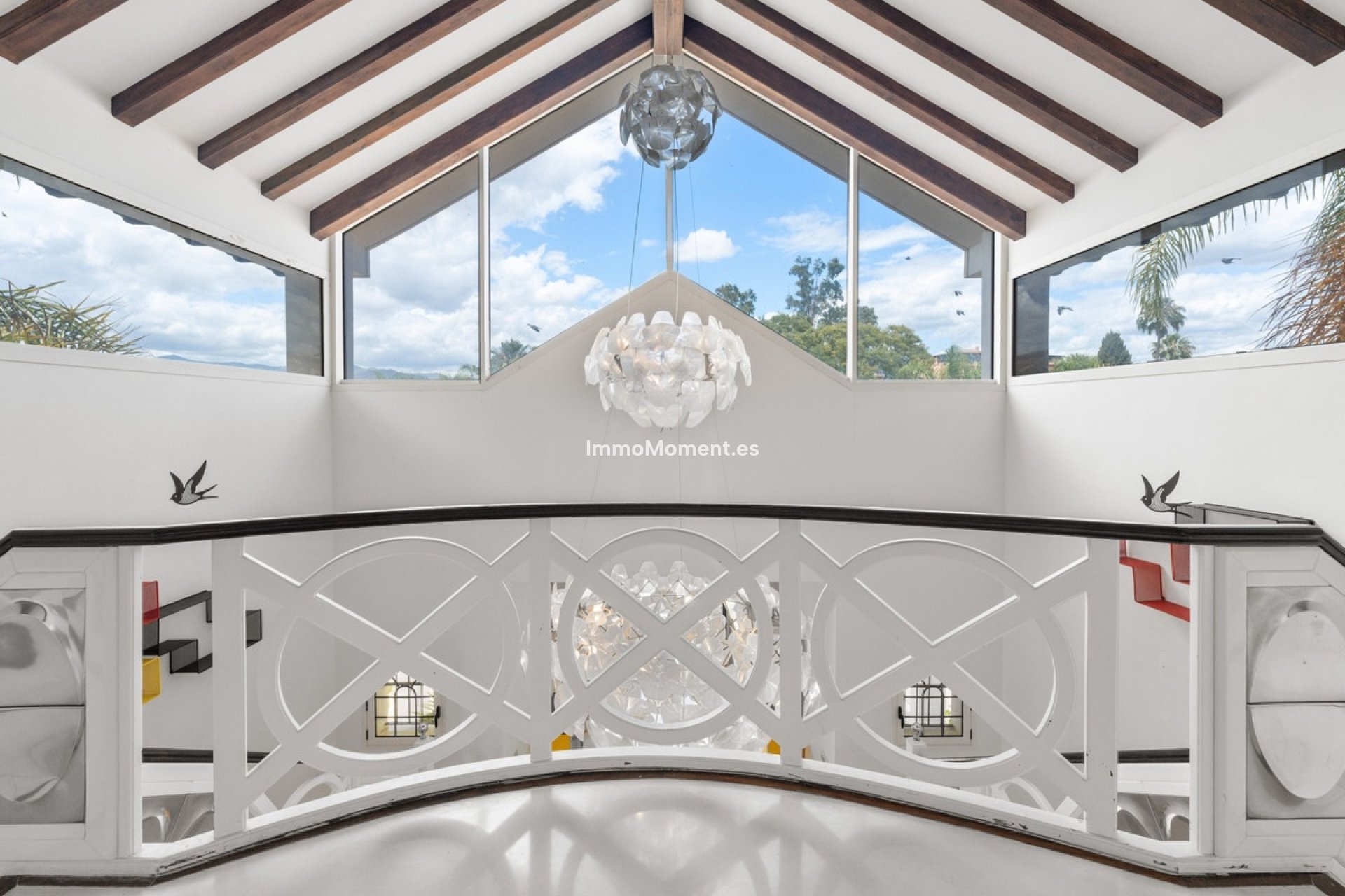 The villa opens with a dramatic double height entrance hall with wooden beams and a statement chandelier. Two elegant living rooms lead to a large covered terrace facing the sea. The property includes a formal dining room and a bright modern kitchen with a central island. The ground floor also features two ensuite bedrooms with marble bathrooms.